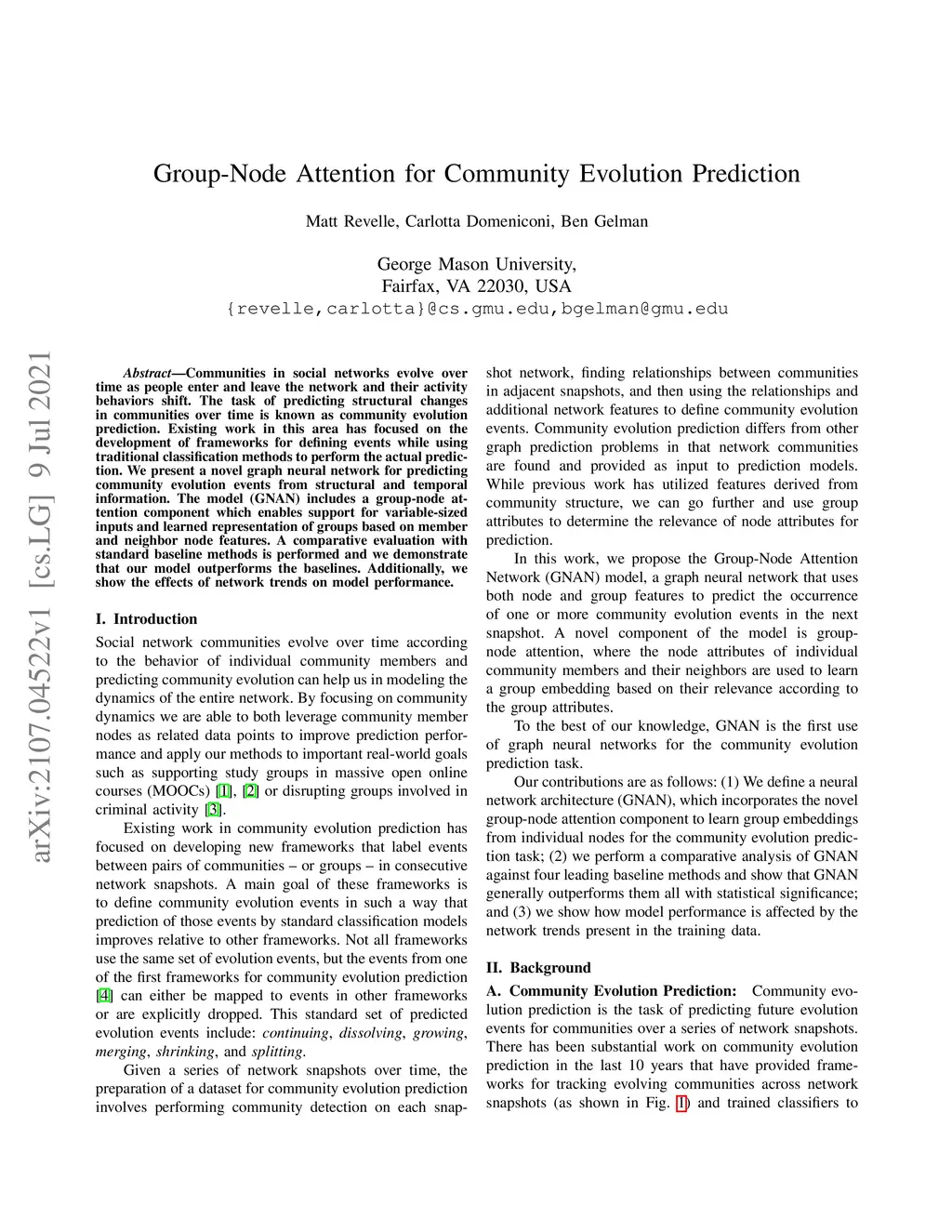 Communities in social networks evolve over time as people enter and leave the network and their activity behaviors shift. The task of predicting structural changes in communities over time is known as community evolution prediction. Existing work in this area has focused on the development of frameworks for defining events while using traditional classification methods to perform the actual prediction. We present a novel graph neural network for predicting community evolution events from structural and temporal information. The model (GNAN) includes a group-node attention component which enables support for variable-sized inputs and learned representation of groups based on member and neighbor node features. A comparative evaluation with standard baseline methods is performed and we demonstrate that our model outperforms the baselines. Additionally, we show the effects of network trends on model performance.