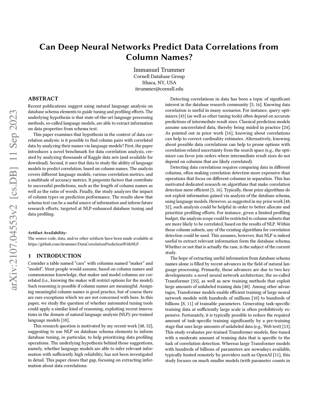 Can Deep Neural Networks Predict Data Correlations from Column Names?