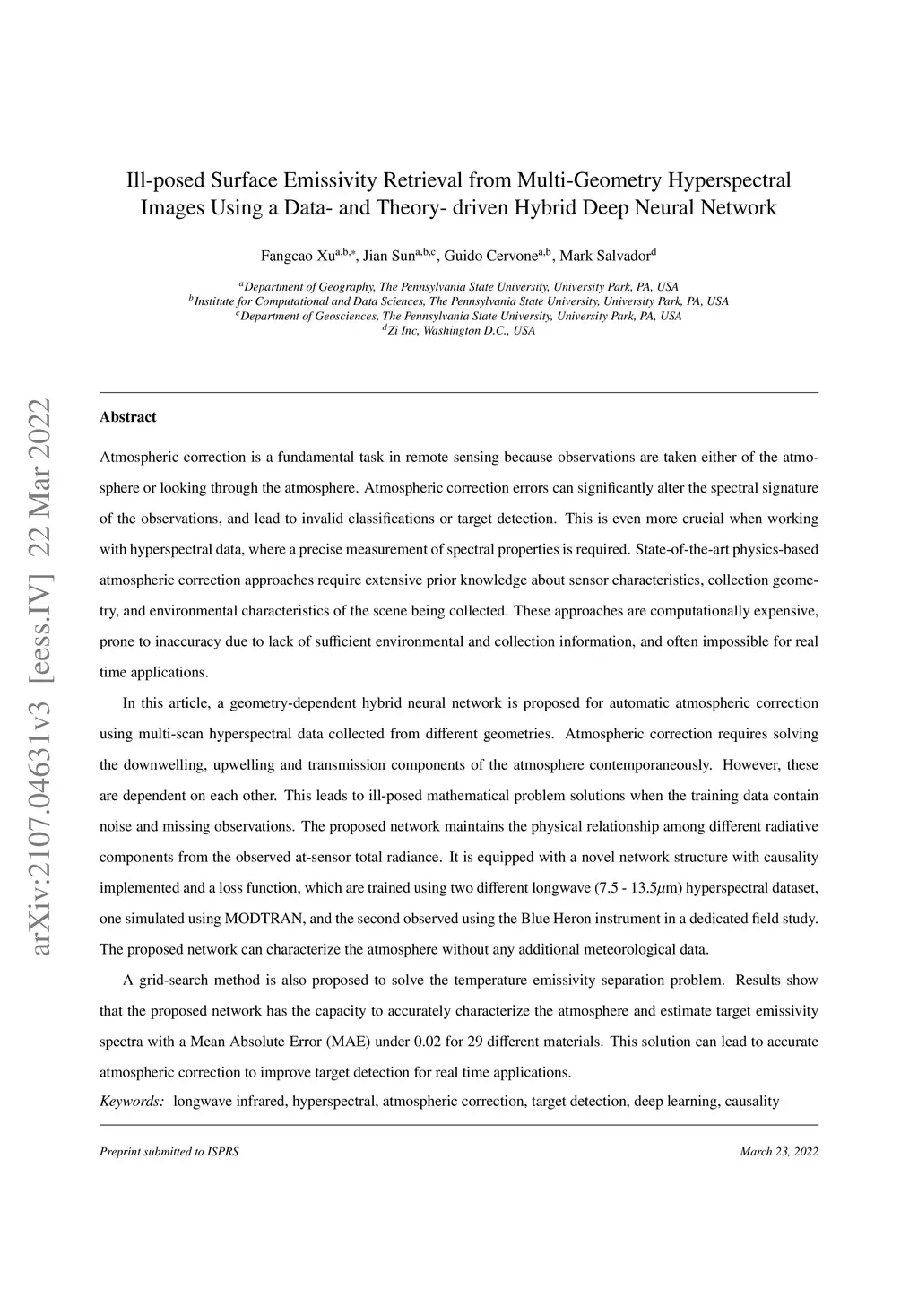 Atmospheric correction is a fundamental task in remote sensing because observations are taken either of the atmosphere or looking through the atmosphere. Atmospheric correction errors can significantly alter the spectral signature of the observations, and lead to invalid classifications or target detection. This is even more crucial when working with hyperspectral data, where a precise measurement of spectral properties is required. State-of-the-art physics-based atmospheric correction approaches require extensive prior knowledge about sensor characteristics, collection geometry, and environmental characteristics of the scene being collected. These approaches are computationally expensive, prone to inaccuracy due to lack of sufficient environmental and collection information, and often impossible for real-time applications. In this paper, a geometry-dependent hybrid neural network is proposed for automatic atmospheric correction using multi-scan hyperspectral data collected from different geometries. The proposed network can characterize the atmosphere without any additional meteorological data. A grid-search method is also proposed to solve the temperature emissivity separation problem. Results show that the proposed network has the capacity to accurately characterize the atmosphere and estimate target emissivity spectra with a Mean Absolute Error (MAE) under 0.02 for 29 different materials. This solution can lead to accurate atmospheric correction to improve target detection for real time applications.