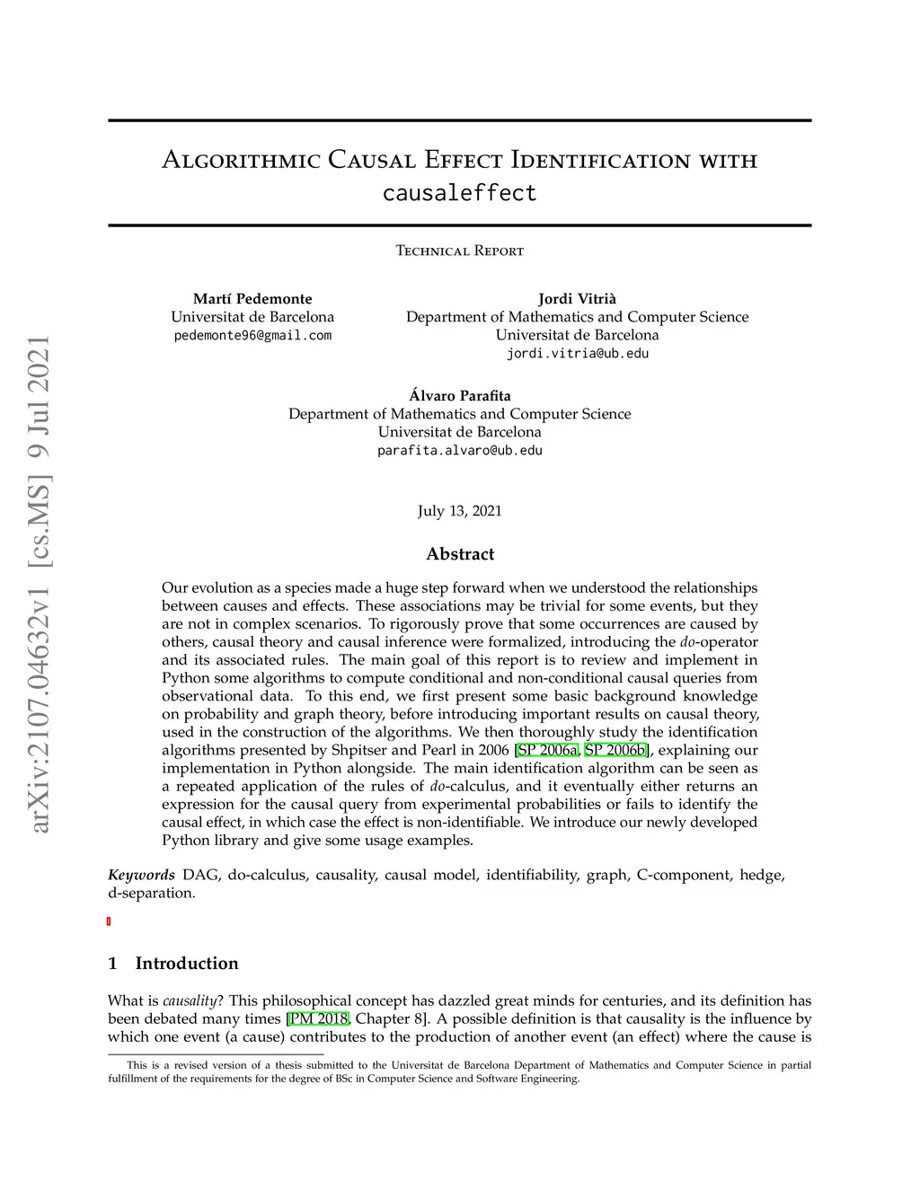 Our evolution as a species made a huge step forward when we understood the relationships between causes and effects. These associations may be trivial for some events, but they are not in complex scenarios. To rigorously prove that some occurrences are caused by others, causal theory and causal inference were formalized, introducing the -operator and its associated rules. The main goal of this report is to review and implement in Python some algorithms to compute conditional and non-conditional causal queries from observational data. To this end, we first present some basic background knowledge on probability and graph theory, before introducing important results on causal theory, used in the construction of the algorithms. We then thoroughly study the identification algorithms presented by Shpitser and Pearl in 2006, explaining our implementation in Python alongside. The main identification algorithm can be seen as a repeated application of the rules of -calculus, and it eventually either returns an expression for the causal query from experimental probabilities or fails to identify the causal effect, in which case the effect is non-identifiable. We introduce our newly developed Python library and give some usage examples.
