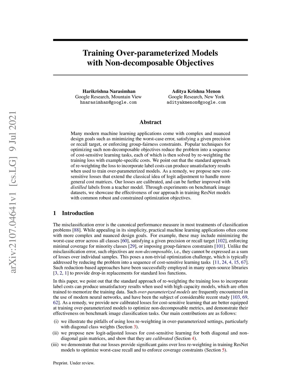 Many modern machine learning applications come with complex and nuanced design goals such as minimizing the worst-case error, satisfying a given precision or recall target, or enforcing group-fairness constraints. Popular techniques for optimizing such non-decomposable objectives reduce the problem into a sequence of cost-sensitive learning tasks, each of which is then solved by re-weighting the training loss with example-specific costs. We point out that the standard approach of re-weighting the loss to incorporate label costs can produce unsatisfactory results when used to train over-parameterized models. As a remedy, we propose new cost-sensitive losses that extend the classical idea of logit adjustment to handle more general cost matrices. Our losses are calibrated, and can be further improved with distilled labels from a teacher model. Through experiments on benchmark image datasets, we showcase the effectiveness of our approach in training ResNet models with common robust and constrained optimization objectives.