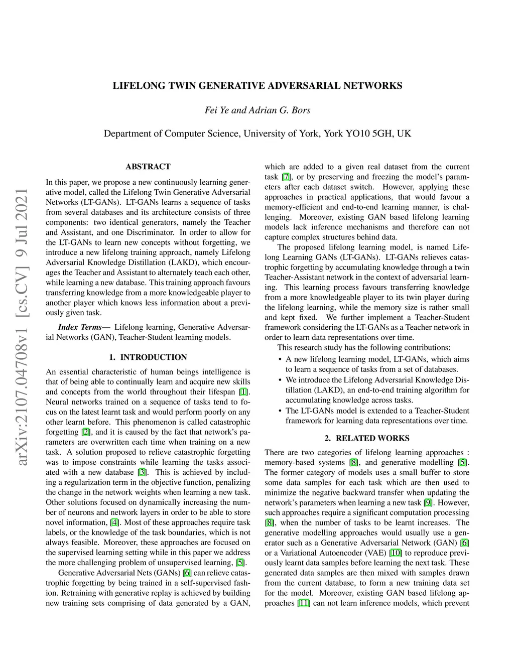 In this paper, we propose a new continuously learning generative model, called the Lifelong Twin Generative Adversarial Networks (LT-GANs). LT-GANs learns a sequence of tasks from several databases and its architecture consists of three components: two identical generators, namely the Teacher and Assistant, and one Discriminator. In order to allow for the LT-GANs to learn new concepts without forgetting, we introduce a new lifelong training approach, namely Lifelong Adversarial Knowledge Distillation (LAKD), which encourages the Teacher and Assistant to alternately teach each other, while learning a new database. This training approach favours transferring knowledge from a more knowledgeable player to another player which knows less information about a previously given task.