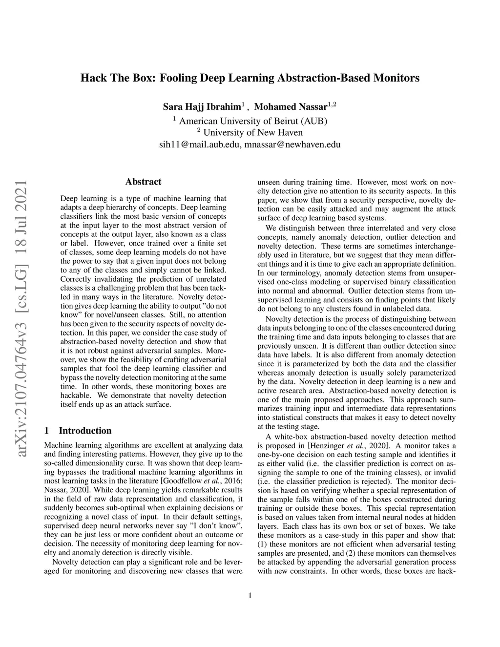 Deep learning is a type of machine learning that adapts a deep hierarchy of concepts. Deep learning classifiers link the most basic version of concepts at the input layer to the most abstract version of concepts at the output layer, also known as a class or label. However, once trained over a finite set of classes, some deep learning models do not have the power to say that a given input does not belong to any of the classes and simply cannot be linked. Correctly invalidating the prediction of unrelated classes is a challenging problem that has been tackled in many ways in the literature. Novelty detection gives deep learning the ability to output "do not know" for novel/unseen classes. Still, no attention has been given to the security aspects of novelty detection. In this paper, we consider the case study of abstraction-based novelty detection and show that it is not robust against adversarial samples. Moreover, we show the feasibility of crafting adversarial samples that fool the deep learning classifier and bypass the novelty detection monitoring at the same time. In other words, these monitoring boxes are hackable. We demonstrate that novelty detection itself ends up as an attack surface.