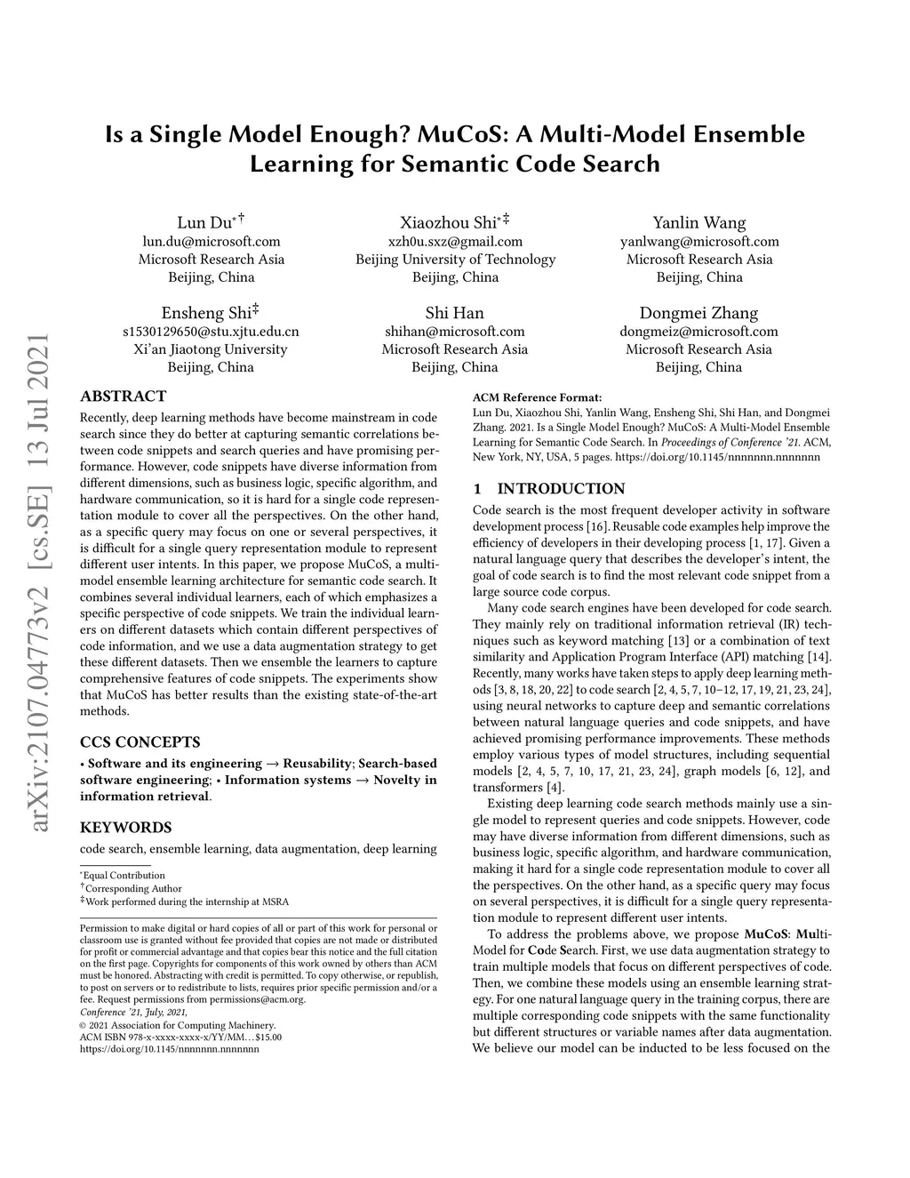 Recently, deep learning methods have become mainstream in code search since they do better at capturing semantic correlations between code snippets and search queries and have promising performance. However, code snippets have diverse information from different dimensions, such as business logic, specific algorithm, and hardware communication, so it is hard for a single code representation module to cover all the perspectives. On the other hand, as a specific query may focus on one or several perspectives, it is difficult for a single query representation module to represent different user intents. In this paper, we propose MuCoS, a multi-model ensemble learning architecture for semantic code search. It combines several individual learners, each of which emphasizes a specific perspective of code snippets. We train the individual learners on different datasets which contain different perspectives of code information, and we use a data augmentation strategy to get these different datasets. Then we ensemble the learners to capture comprehensive features of code snippets.