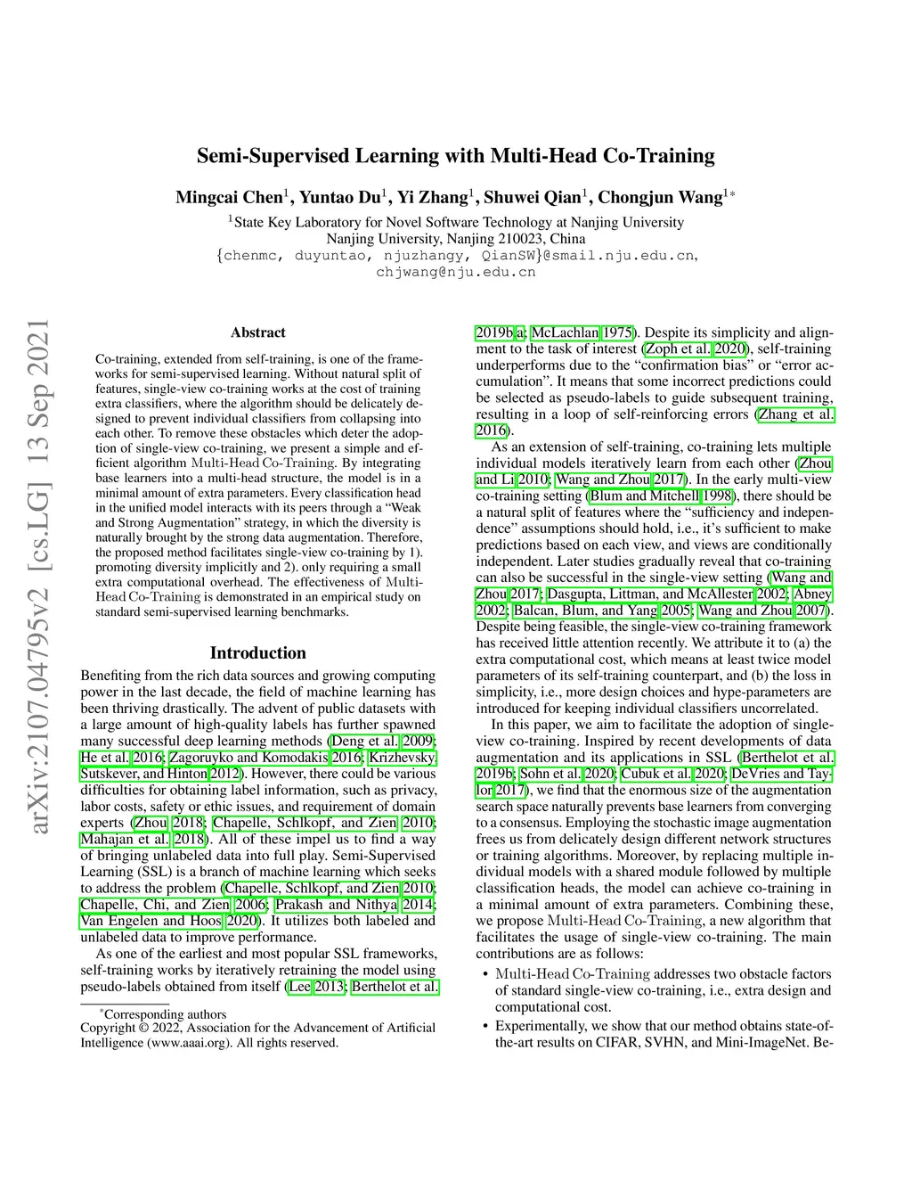 Co-training, extended from self-training, is one of the frameworks for semi-supervised learning. Without natural split of features, single-view co-training works at the cost of training extra classifiers, where the algorithm should be delicately designed to prevent individual classifiers from collapsing into each other. To remove these obstacles which deter the adoption of single-view co-training, we present a simple and efficient algorithm Multi-Head Co-Training. By integrating base learners into a multi-head structure, the model is in a minimal amount of extra parameters. Every classification head in the unified model interacts with its peers through a "Weak and Strong Augmentation" strategy, in which the diversity is naturally brought by the strong data augmentation. Therefore, the proposed method facilitates single-view co-training by 1). promoting diversity implicitly and 2). only requiring a small extra computational overhead. The effectiveness of Multi-Head Co-Training is demonstrated in an empirical study on standard semi-supervised learning benchmarks.
