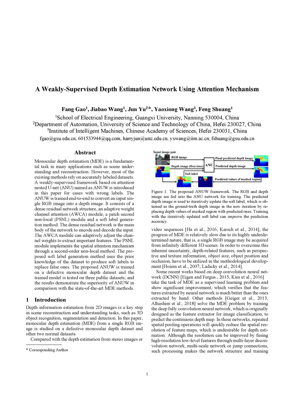 Monocular depth estimation (MDE) is a fundamental task in many applications such as scene understanding and reconstruction. However, most of the existing methods rely on accurately labeled datasets. A weakly-supervised framework based on attention nested U-net (ANU) named as ANUW is introduced in this paper for cases with wrong labels. The ANUW is trained end-to-end to convert an input single RGB image into a depth image. It consists of a dense residual network structure, an adaptive weight channel attention (AWCA) module, a patch second non-local (PSNL) module and a soft label generation method. The dense residual network is the main body of the network to encode and decode the input. The AWCA module can adaptively adjust the channel weights to extract important features. The PSNL module implements the spatial attention mechanism through a second-order non-local method. The proposed soft label generation method uses the prior knowledge of the dataset to produce soft labels to replace false ones. The proposed ANUW is trained on a defective monocular depth dataset and the trained model is tested on three public datasets, and the results demonstrate the superiority of ANUW in comparison with the state-of-the-art MDE methods.