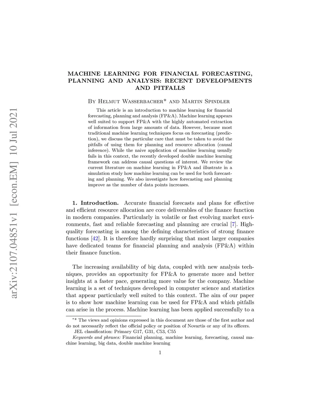 This article is an introduction to machine learning for financial forecasting, planning and analysis (FP\&A). Machine learning appears well suited to support FP\&A with the highly automated extraction of information from large amounts of data. However, because most traditional machine learning techniques focus on forecasting (prediction), we discuss the particular care that must be taken to avoid the pitfalls of using them for planning and resource allocation (causal inference). While the naive application of machine learning usually fails in this context, the recently developed double machine learning framework can address causal questions of interest. We review the current literature on machine learning in FP\&A and illustrate in a simulation study how machine learning can be used for both forecasting and planning. We also investigate how forecasting and planning improve as the number of data points increases.