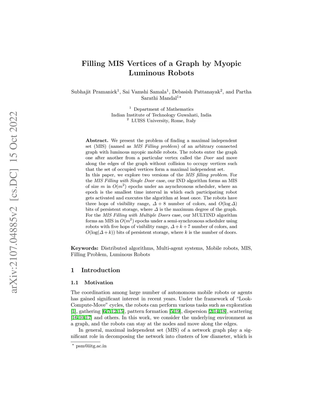 We present the problem of finding a maximal independent set (MIS) (named as \emph{MIS Filling problem}) of an arbitrary connected graph having vertices with luminous myopic mobile robots. The robots enter the graph one after another from a particular vertex called the \emph{Door} and disperse along the edges of the graph without collision to occupy vertices such that the set of vertices occupied by the robots is a maximal independent set. We assume the robots have knowledge only about the maximum degree of the graph, denoted by . In this paper, we explore two versions of the problem: the solution to the first version, named as \emph{MIS Filling with Single Door}, works under an asynchronous scheduler using robots with 3 hops of visibility range, number of colors and bits of persistent storage. The time complexity is measured in terms of epochs and it can be solved in epochs. An epoch is the smallest time interval in which each participating robot gets activated and executes the algorithm at least once. For the second version with \textit{Doors}, named as \emph{MIS Filling with Multiple Doors}, the solution works under a semi-synchronous scheduler using robots with 5 hops of visibility range, number of colors and bits of persistent storage. The problem with multiple Doors can be solved in epochs.