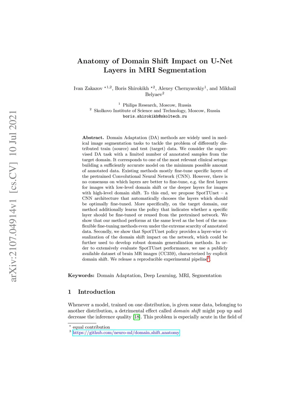 Domain Adaptation (DA) methods are widely used in medical image segmentation tasks to tackle the problem of differently distributed train (source) and test (target) data. We consider the supervised DA task with a limited number of annotated samples from the target domain. It corresponds to one of the most relevant clinical setups: building a sufficiently accurate model on the minimum possible amount of annotated data. Existing methods mostly fine-tune specific layers of the pretrained Convolutional Neural Network (CNN). However, there is no consensus on which layers are better to fine-tune, e.g. the first layers for images with low-level domain shift or the deeper layers for images with high-level domain shift. To this end, we propose SpotTUnet - a CNN architecture that automatically chooses the layers which should be optimally fine-tuned. More specifically, on the target domain, our method additionally learns the policy that indicates whether a specific layer should be fine-tuned or reused from the pretrained network. We show that our method performs at the same level as the best of the nonflexible fine-tuning methods even under the extreme scarcity of annotated data. Secondly, we show that SpotTUnet policy provides a layer-wise visualization of the domain shift impact on the network, which could be further used to develop robust domain generalization methods. In order to extensively evaluate SpotTUnet performance, we use a publicly available dataset of brain MR images (CC359), characterized by explicit domain shift. We release a reproducible experimental pipeline.
