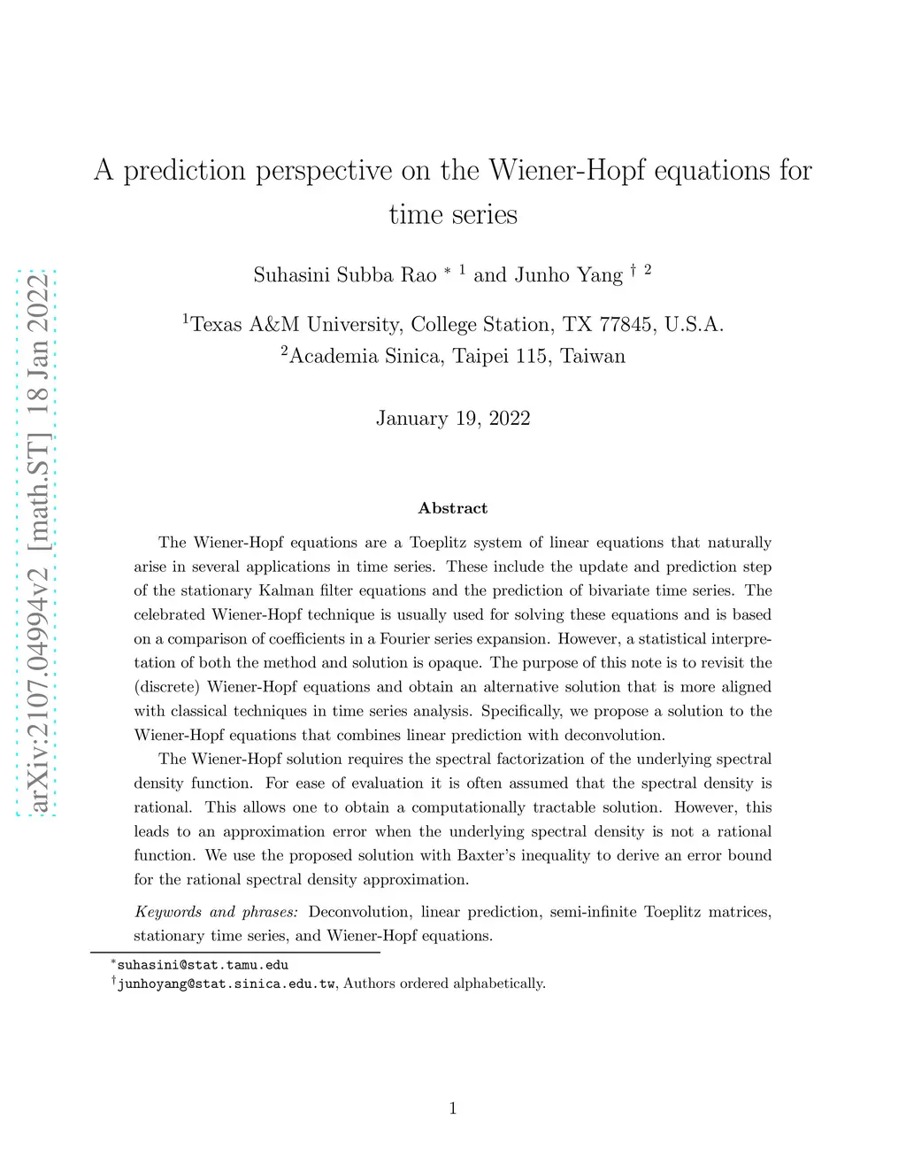 The Wiener-Hopf equations are a Toeplitz system of linear equations that have several applications in time series. These include the update and prediction step of the stationary Kalman filter equations and the prediction of bivariate time series. The Wiener-Hopf technique is the classical tool for solving the equations, and is based on a comparison of coefficients in a Fourier series expansion. The purpose of this note is to revisit the (discrete) Wiener-Hopf equations and obtain an alternative expression for the solution that is more in the spirit of time series analysis. Specifically, we propose a solution to the Wiener-Hopf equations that combines linear prediction with deconvolution. The solution of the Wiener-Hopf equations requires one to obtain the spectral factorization of the underlying spectral density function. For general spectral density functions this is infeasible. Therefore, it is usually assumed that the spectral density is rational, which allows one to obtain a computationally tractable solution. This leads to an approximation error when the underlying spectral density is not a rational function. We use the proposed solution together with Baxter's inequality to derive an error bound for the rational spectral density approximation.