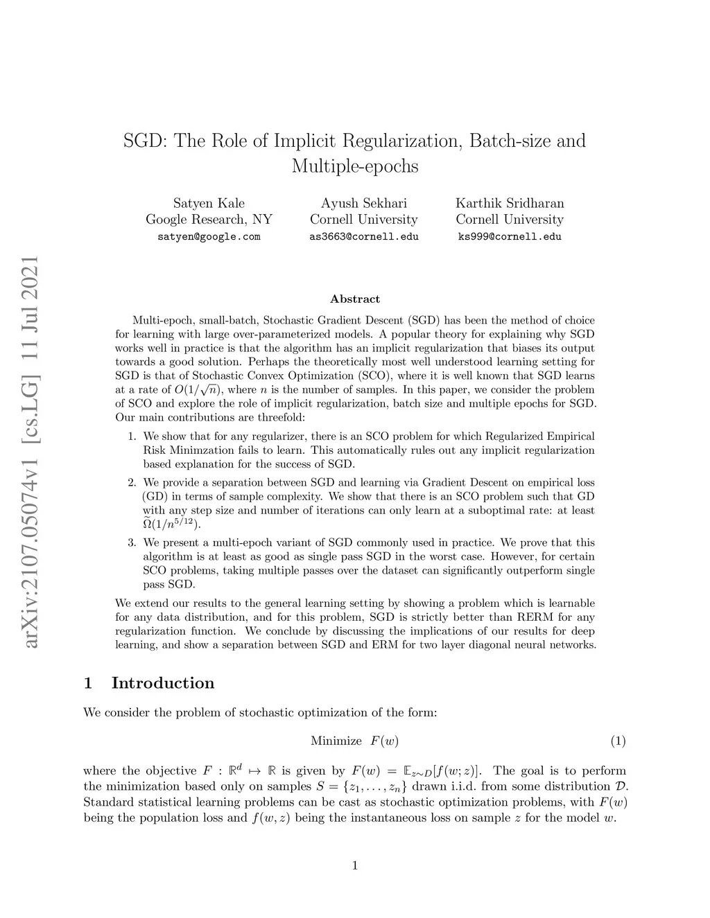 Multi-epoch, small-batch, Stochastic Gradient Descent (SGD) has been the method of choice for learning with large over-parameterized models. A popular theory for explaining why SGD works well in practice is that the algorithm has an implicit regularization that biases its output towards a good solution. Perhaps the theoretically most well understood learning setting for SGD is that of Stochastic Convex Optimization (SCO), where it is well known that SGD learns at a rate of , where is the number of samples. In this paper, we consider the problem of SCO and explore the role of implicit regularization, batch size and multiple epochs for SGD. Our main contributions are threefold: (a) We show that for any regularizer, there is an SCO problem for which Regularized Empirical Risk Minimzation fails to learn. This automatically rules out any implicit regularization based explanation for the success of SGD. (b) We provide a separation between SGD and learning via Gradient Descent on empirical loss (GD) in terms of sample complexity. We show that there is an SCO problem such that GD with any step size and number of iterations can only learn at a suboptimal rate: at least . (c) We present a multi-epoch variant of SGD commonly used in practice. We prove that this algorithm is at least as good as single pass SGD in the worst case. However, for certain SCO problems, taking multiple passes over the dataset can significantly outperform single pass SGD. We extend our results to the general learning setting by showing a problem which is learnable for any data distribution, and for this problem, SGD is strictly better than RERM for any regularization function. We conclude by discussing the implications of our results for deep learning, and show a separation between SGD and ERM for two layer diagonal neural networks.