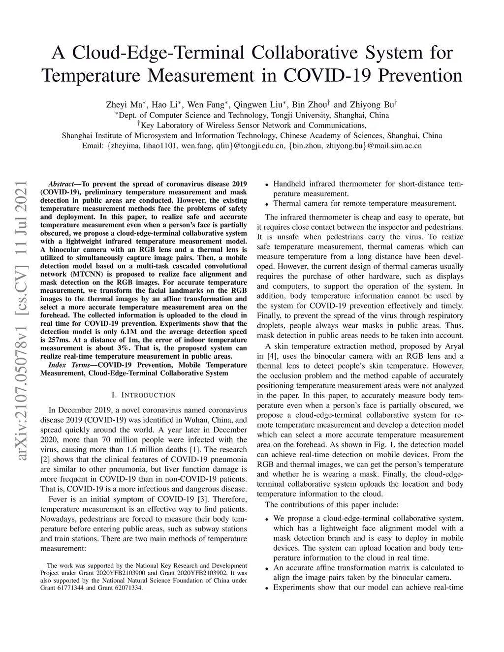 To prevent the spread of coronavirus disease 2019 (COVID-19), preliminary temperature measurement and mask detection in public areas are conducted. However, the existing temperature measurement methods face the problems of safety and deployment. In this paper, to realize safe and accurate temperature measurement even when a person's face is partially obscured, we propose a cloud-edge-terminal collaborative system with a lightweight infrared temperature measurement model. A binocular camera with an RGB lens and a thermal lens is utilized to simultaneously capture image pairs. Then, a mobile detection model based on a multi-task cascaded convolutional network (MTCNN) is proposed to realize face alignment and mask detection on the RGB images. For accurate temperature measurement, we transform the facial landmarks on the RGB images to the thermal images by an affine transformation and select a more accurate temperature measurement area on the forehead. The collected information is uploaded to the cloud in real time for COVID-19 prevention. Experiments show that the detection model is only 6.1M and the average detection speed is 257ms. At a distance of 1m, the error of indoor temperature measurement is about 3%. That is, the proposed system can realize real-time temperature measurement in public areas.
