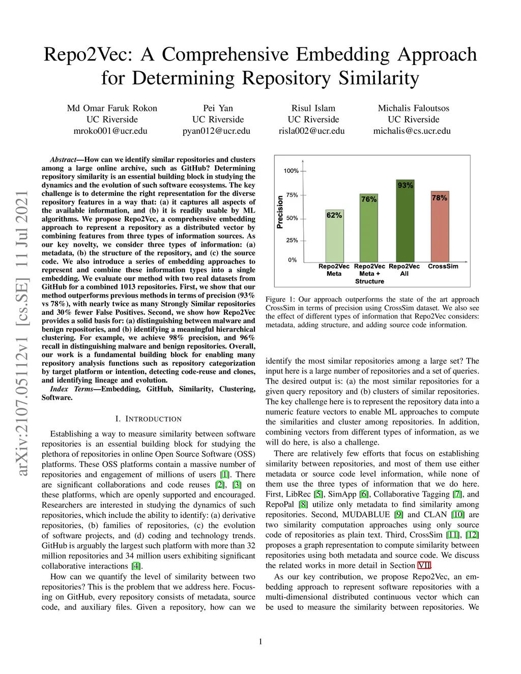 How can we identify similar repositories and clusters among a large online archive, such as GitHub? Determiningrepository similarity is an essential building block in studying the dynamics and the evolution of such software ecosystems. The key challenge is to determine the right representation for the diverse repository features in a way that: (a) it captures all aspects of the available information, and (b) it is readily usable by MLalgorithms. We propose Repo2Vec, a comprehensive embedding approach to represent a repository as a distributed vector by combining features from three types of information sources. As our key novelty, we consider three types of information: (a)metadata, (b) the structure of the repository, and (c) the source code. We also introduce a series of embedding approaches to represent and combine these information types into a single embedding. We evaluate our method with two real datasets from GitHub for a combined 1013 repositories. First, we show that our method outperforms previous methods in terms of precision (93%vs 78%), with nearly twice as many Strongly Similar repositories and 30% fewer False Positives. Second, we show how Repo2Vecprovides a solid basis for: (a) distinguishing between malware and benign repositories, and (b) identifying a meaningful hierarchical clustering. For example, we achieve 98% precision and 96%recall in distinguishing malware and benign repositories. Overall, our work is a fundamental building block for enabling many repository analysis functions such as repository categorization by target platform or intention, detecting code-reuse and clones, and identifying lineage and evolution.