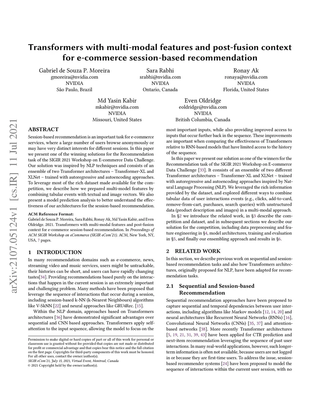 Session-based recommendation is an important task for e-commerce services, where a large number of users browse anonymously or may have very distinct interests for different sessions. In this paper we present one of the winning solutions for the Recommendation task of the SIGIR 2021 Workshop on E-commerce Data Challenge. Our solution was inspired by NLP techniques and consists of an ensemble of two Transformer architectures - Transformer-XL and XLNet - trained with autoregressive and autoencoding approaches. To leverage most of the rich dataset made available for the competition, we describe how we prepared multi-model features by combining tabular events with textual and image vectors. We also present a model prediction analysis to better understand the effectiveness of our architectures for the session-based recommendation.