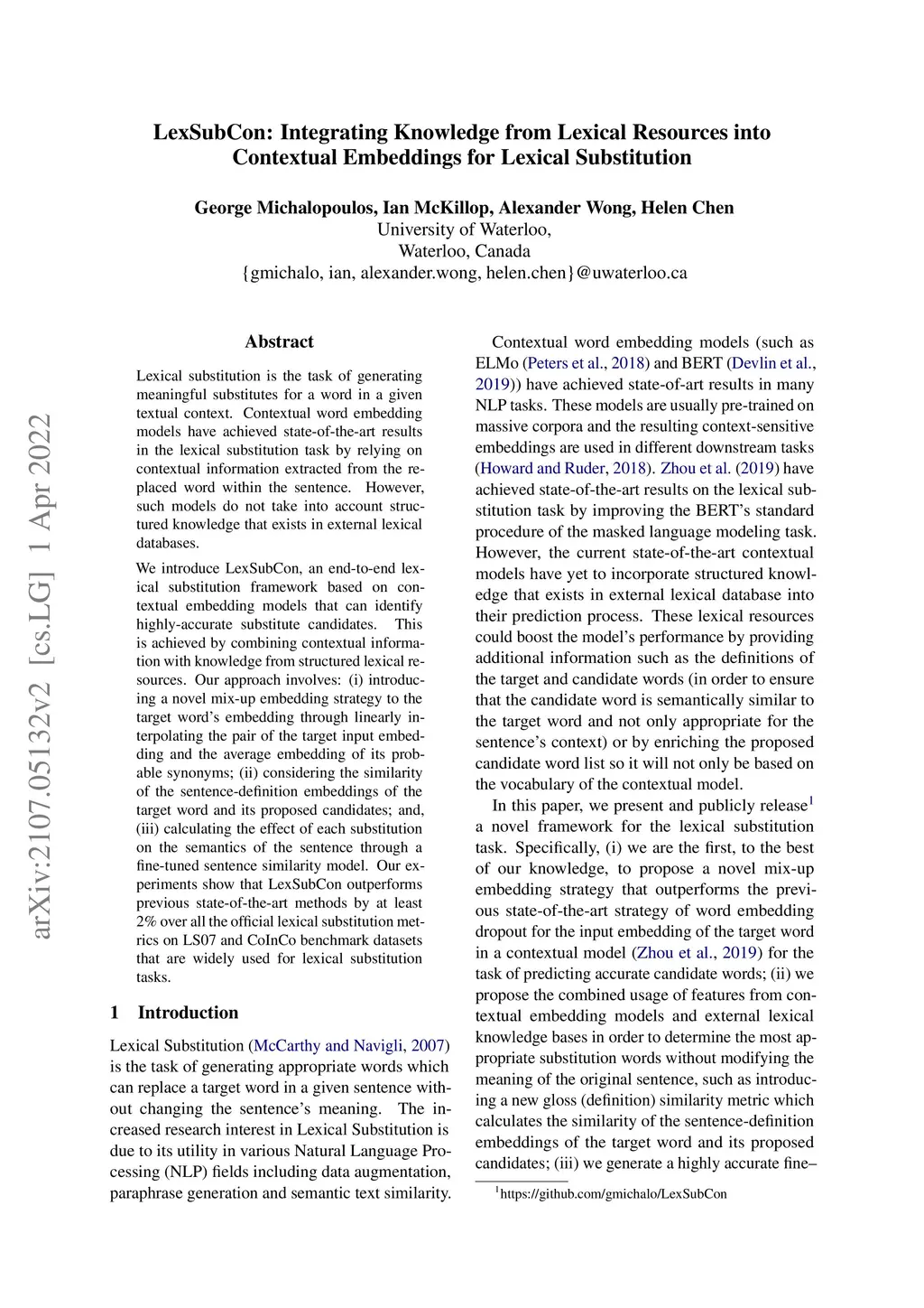 Lexical substitution is the task of generating meaningful substitutes for a word in a given textual context. Contextual word embedding models have achieved state-of-the-art results in the lexical substitution task by relying on contextual information extracted from the replaced word within the sentence. However, such models do not take into account structured knowledge that exists in external lexical databases. We introduce LexSubCon, an end-to-end lexical substitution framework based on contextual embedding models that can identify highly accurate substitute candidates. This is achieved by combining contextual information with knowledge from structured lexical resources. Our approach involves: (i) introducing a novel mix-up embedding strategy in the creation of the input embedding of the target word through linearly interpolating the pair of the target input embedding and the average embedding of its probable synonyms; (ii) considering the similarity of the sentence-definition embeddings of the target word and its proposed candidates; and, (iii) calculating the effect of each substitution in the semantics of the sentence through a fine-tuned sentence similarity model. Our experiments show that LexSubCon outperforms previous state-of-the-art methods on LS07 and CoInCo benchmark datasets that are widely used for lexical substitution tasks.