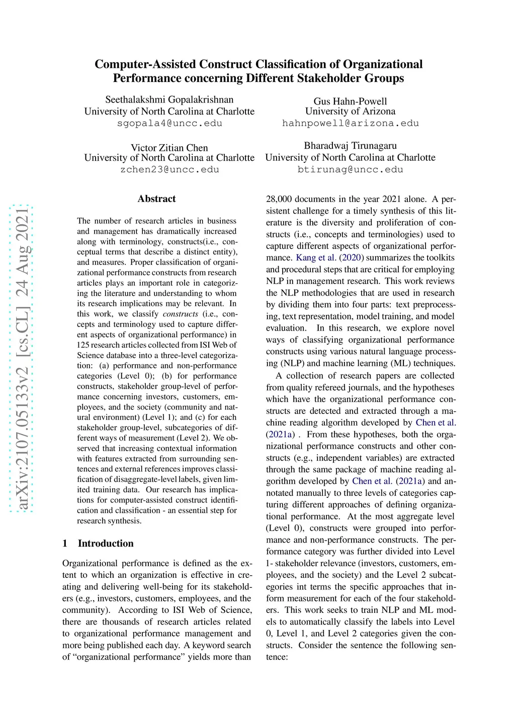 The number of research articles in business and management has dramatically increased along with terminology, constructs, and measures. Proper classification of organizational performance constructs from research articles plays an important role in categorizing the literature and understanding to whom its research implications may be relevant. In this work, we classify constructs (i.e., concepts and terminology used to capture different aspects of organizational performance) in research articles into a three-level categorization: (a) performance and non-performance categories (Level 0); (b) for performance constructs, stakeholder group-level of performance concerning investors, customers, employees, and the society (community and natural environment) (Level 1); and (c) for each stakeholder group-level, subcategories of different ways of measurement (Level 2). We observed that increasing contextual information with features extracted from surrounding sentences and external references improves classification of disaggregate-level labels, given limited training data. Our research has implications for computer-assisted construct identification and classification - an essential step for research synthesis.