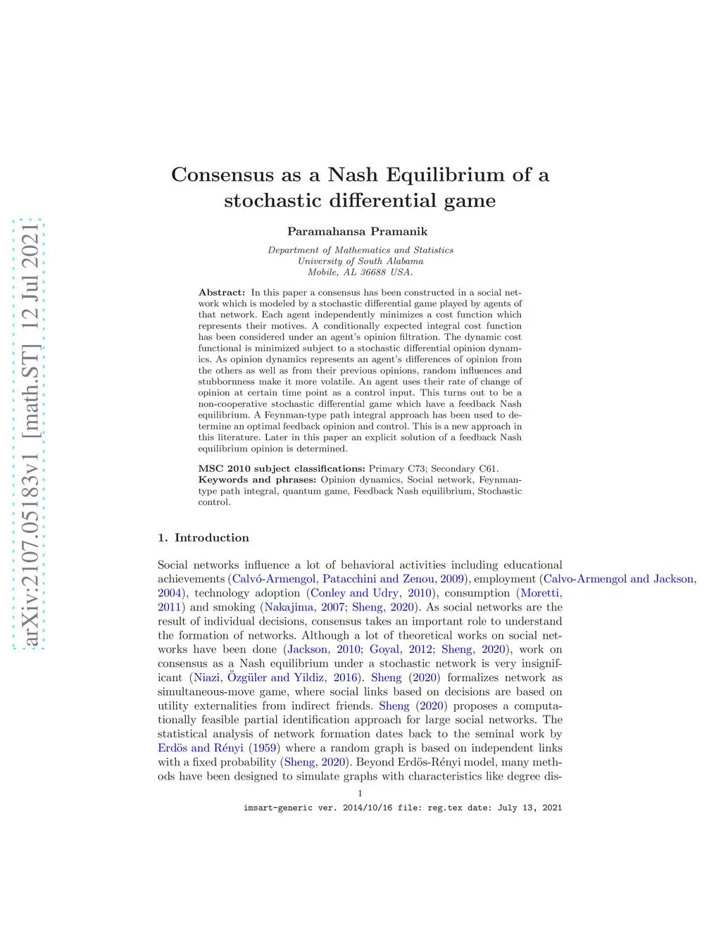 In this paper a consensus has been constructed in a social network which is modeled by a stochastic differential game played by agents of that network. Each agent independently minimizes a cost function which represents their motives. A conditionally expected integral cost function has been considered under an agent's opinion filtration. The dynamic cost functional is minimized subject to a stochastic differential opinion dynamics. As opinion dynamics represents an agent's differences of opinion from the others as well as from their previous opinions, random influences and stubbornness make it more volatile. An agent uses their rate of change of opinion at certain time point as a control input. This turns out to be a non-cooperative stochastic differential game which have a feedback Nash equilibrium. A Feynman-type path integral approach has been used to determine an optimal feedback opinion and control. This is a new approach in this literature. Later in this paper an explicit solution of a feedback Nash equilibrium opinion is determined.