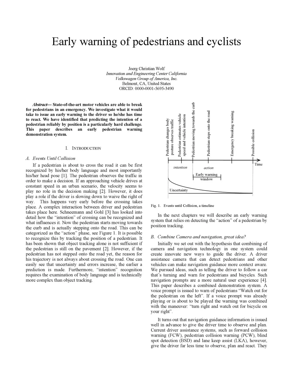 State-of-the-art motor vehicles are able to break for pedestrians in an emergency. We investigate what it would take to issue an early warning to the driver so he/she has time to react. We have identified that predicting the intention of a pedestrian reliably by position is a particularly hard challenge. This paper describes an early pedestrian warning demonstration system.