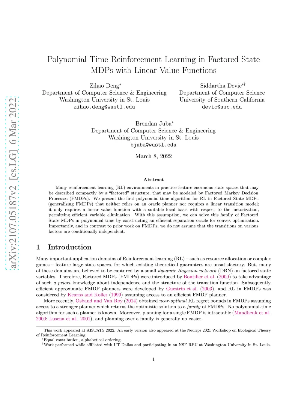 Polynomial Time Reinforcement Learning in Factored State MDPs with