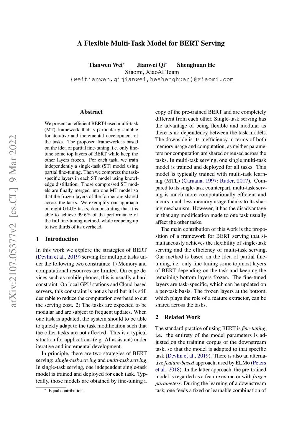 In this demonstration, we present an efficient BERT-based multi-task (MT) framework that is particularly suitable for iterative and incremental development of the tasks. The proposed framework is based on the idea of partial fine-tuning, i.e. only fine-tune some top layers of BERT while keep the other layers frozen. For each task, we train independently a single-task (ST) model using partial fine-tuning. Then we compress the task-specific layers in each ST model using knowledge distillation. Those compressed ST models are finally merged into one MT model so that the frozen layers of the former are shared across the tasks. We exemplify our approach on eight GLUE tasks, demonstrating that it is able to achieve both strong performance and efficiency. We have implemented our method in the utterance understanding system of XiaoAI, a commercial AI assistant developed by Xiaomi. We estimate that our model reduces the overall serving cost by 86%.