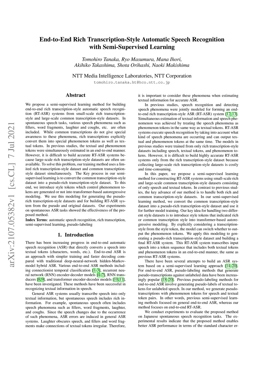 We propose a semi-supervised learning method for building end-to-end rich transcription-style automatic speech recognition (RT-ASR) systems from small-scale rich transcription-style and large-scale common transcription-style datasets. In spontaneous speech tasks, various speech phenomena such as fillers, word fragments, laughter and coughs, etc. are often included. While common transcriptions do not give special awareness to these phenomena, rich transcriptions explicitly convert them into special phenomenon tokens as well as textual tokens. In previous studies, the textual and phenomenon tokens were simultaneously estimated in an end-to-end manner. However, it is difficult to build accurate RT-ASR systems because large-scale rich transcription-style datasets are often unavailable. To solve this problem, our training method uses a limited rich transcription-style dataset and common transcription-style dataset simultaneously. The Key process in our semi-supervised learning is to convert the common transcription-style dataset into a pseudo-rich transcription-style dataset. To this end, we introduce style tokens which control phenomenon tokens are generated or not into transformer-based autoregressive modeling. We use this modeling for generating the pseudo-rich transcription-style datasets and for building RT-ASR system from the pseudo and original datasets. Our experiments on spontaneous ASR tasks showed the effectiveness of the proposed method.