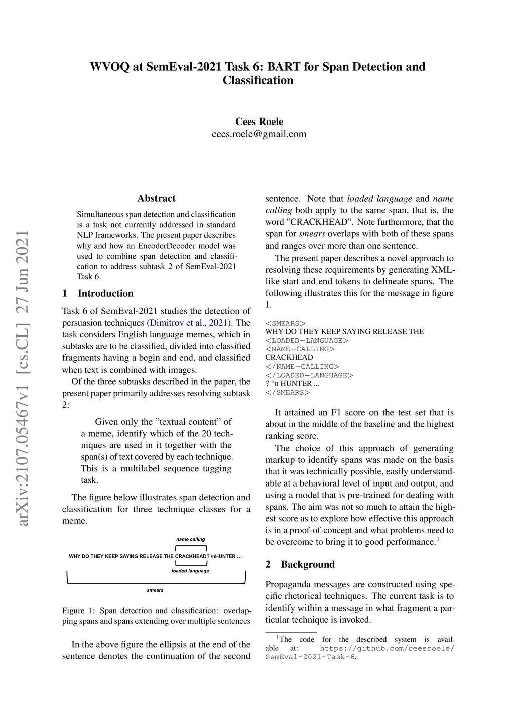 WVOQ at SemEval-2021 Task 6: BART for Span Detection and Classification