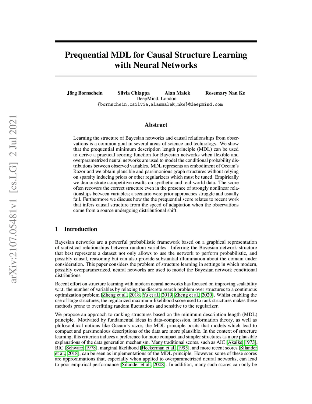 Learning the structure of Bayesian networks and causal relationships from observations is a common goal in several areas of science and technology. We show that the prequential minimum description length principle (MDL) can be used to derive a practical scoring function for Bayesian networks when flexible and overparametrized neural networks are used to model the conditional probability distributions between observed variables. MDL represents an embodiment of Occam's Razor and we obtain plausible and parsimonious graph structures without relying on sparsity inducing priors or other regularizers which must be tuned. Empirically we demonstrate competitive results on synthetic and real-world data. The score often recovers the correct structure even in the presence of strongly nonlinear relationships between variables; a scenario were prior approaches struggle and usually fail. Furthermore we discuss how the the prequential score relates to recent work that infers causal structure from the speed of adaptation when the observations come from a source undergoing distributional shift.