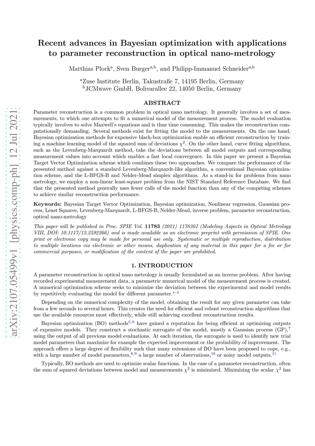 Parameter reconstruction is a common problem in optical nano metrology. It generally involves a set of measurements, to which one attempts to fit a numerical model of the measurement process. The model evaluation typically involves to solve Maxwell's equations and is thus time consuming. This makes the reconstruction computationally demanding. Several methods exist for fitting the model to the measurements. On the one hand, Bayesian optimization methods for expensive black-box optimization enable an efficient reconstruction by training a machine learning model of the squared sum of deviations. On the other hand, curve fitting algorithms, such as the Levenberg-Marquardt method, take the deviations between all model outputs and corresponding measurement values into account which enables a fast local convergence. In this paper we present a Bayesian Target Vector Optimization scheme which combines these two approaches. We compare the performance of the presented method against a standard Levenberg-Marquardt-like algorithm, a conventional Bayesian optimization scheme, and the L-BFGS-B and Nelder-Mead simplex algorithms. As a stand-in for problems from nano metrology, we employ a non-linear least-square problem from the NIST Standard Reference Database. We find that the presented method generally uses fewer calls of the model function than any of the competing schemes to achieve similar reconstruction performance.