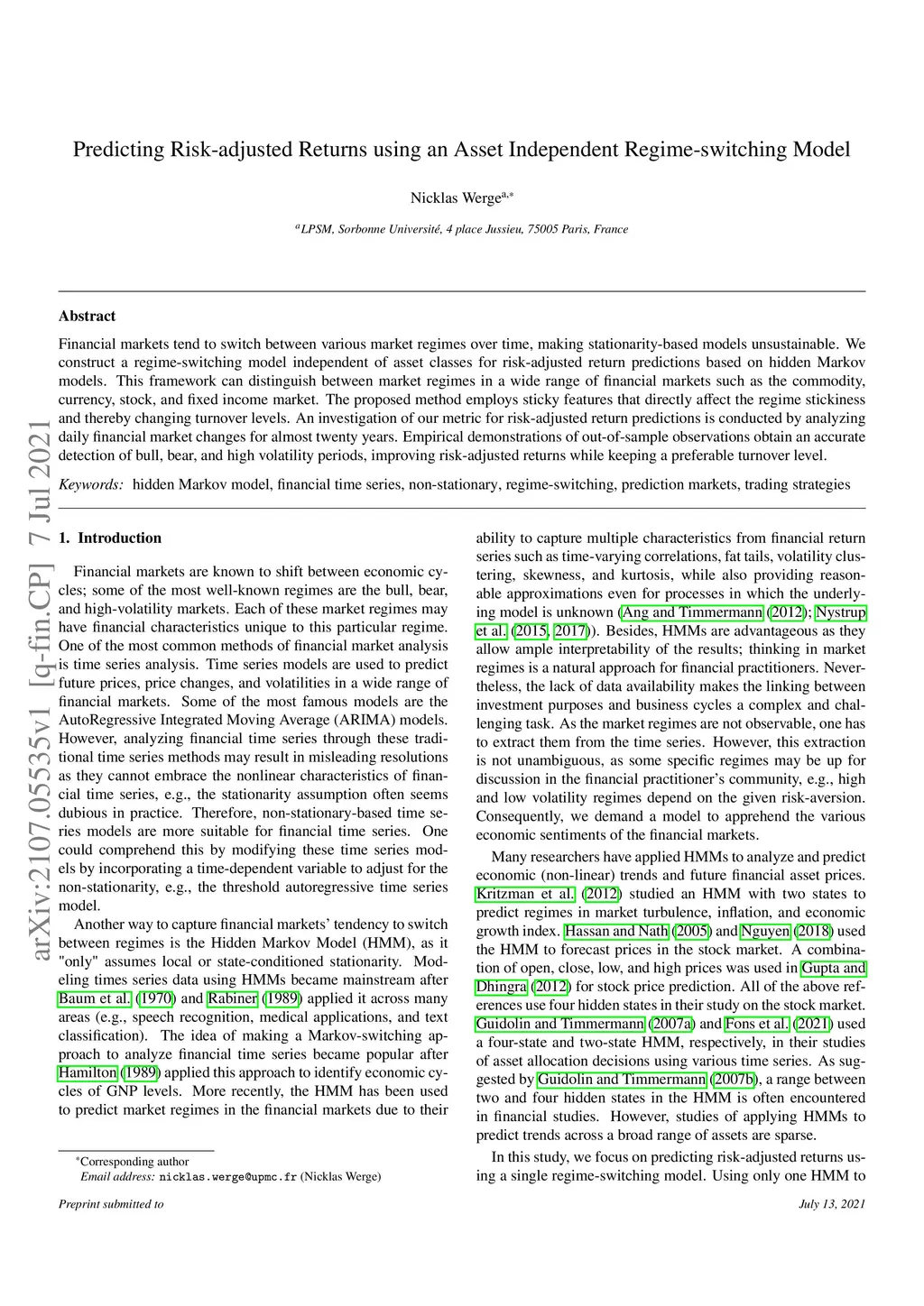 Financial markets tend to switch between various market regimes over time, making stationarity-based models unsustainable. We construct a regime-switching model independent of asset classes for risk-adjusted return predictions based on hidden Markov models. This framework can distinguish between market regimes in a wide range of financial markets such as the commodity, currency, stock, and fixed income market. The proposed method employs sticky features that directly affect the regime stickiness and thereby changing turnover levels. An investigation of our metric for risk-adjusted return predictions is conducted by analyzing daily financial market changes for almost twenty years. Empirical demonstrations of out-of-sample observations obtain an accurate detection of bull, bear, and high volatility periods, improving risk-adjusted returns while keeping a preferable turnover level.