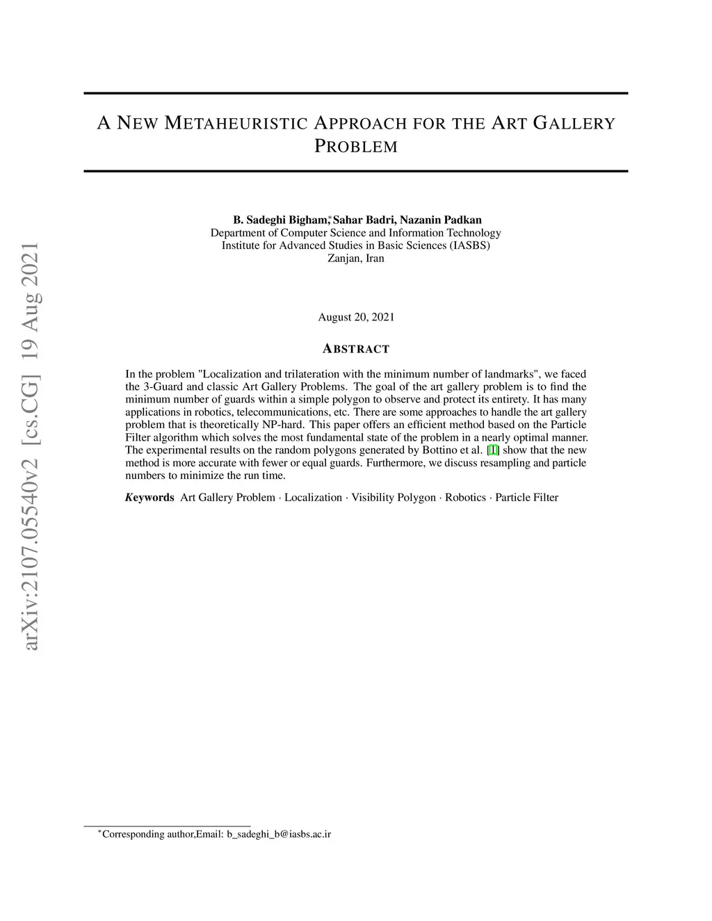 In the problem "Localization and trilateration with the minimum number of landmarks", we faced the 3-Guard and classic Art Gallery Problems. The goal of the art gallery problem is to find the minimum number of guards within a simple polygon to observe and protect its entirety. It has many applications in robotics, telecommunications, etc. There are some approaches to handle the art gallery problem that is theoretically NP-hard. This paper offers an efficient method based on the Particle Filter algorithm which solves the most fundamental state of the problem in a nearly optimal manner. The experimental results on the random polygons generated by Bottino et al. \cite{bottino2011nearly} show that the new method is more accurate with fewer or equal guards. Furthermore, we discuss resampling and particle numbers to minimize the run time.