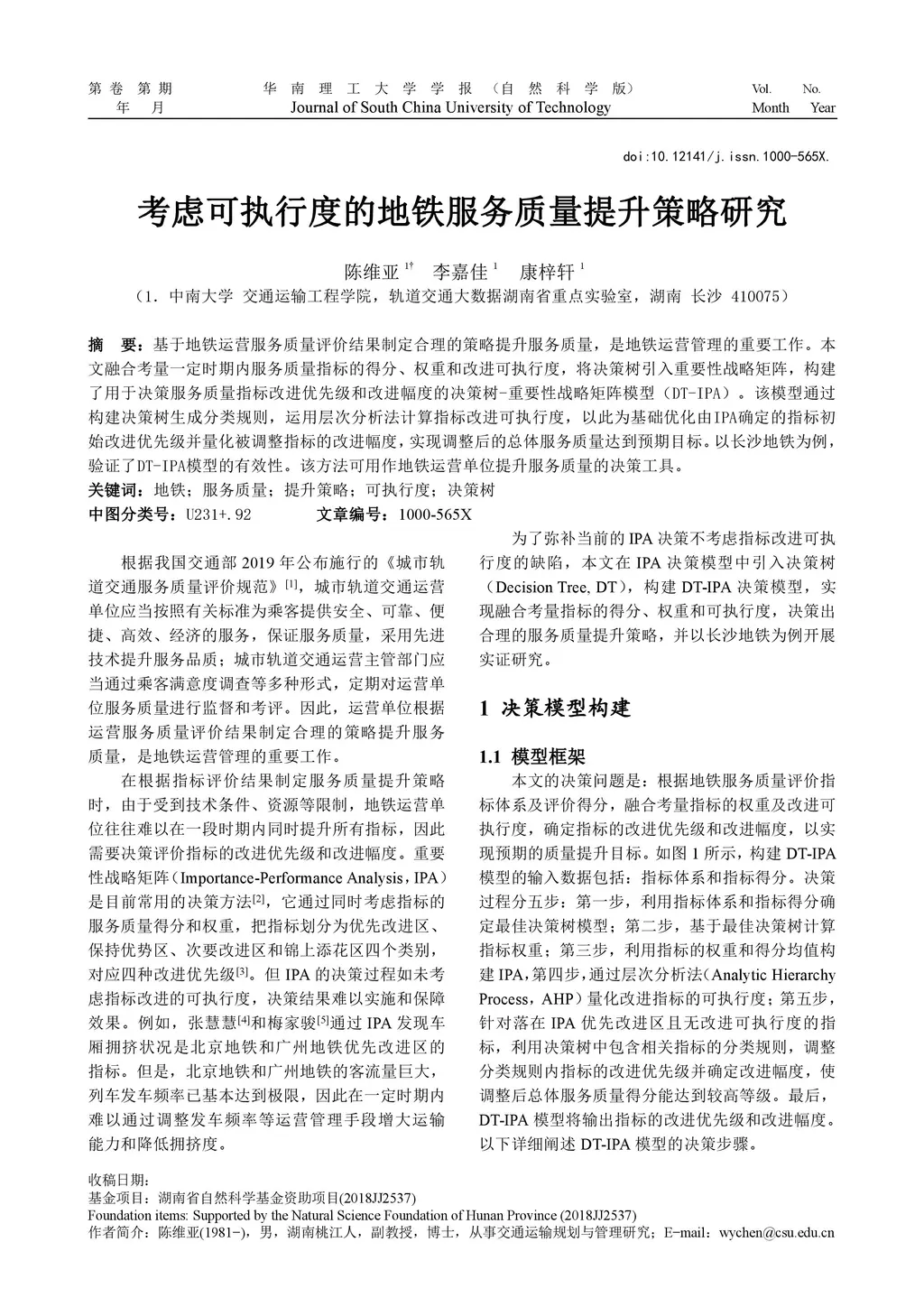It is an important management task of metro agencies to formulate reasonable improvement schemes based on the result of service quality surveys. Considering scores, weights, and improvement feasibility of service quality attributes in a certain period, this paper integrates Decision Tree (DT) into Importance-Performance analysis (IPA) to build a DT-IPA model, which is used to determine the improvement priority of attributes, and to quantify the improvement degree. If-then rules extracted from the optimal decision tree and the improvement feasibility computed by analytic hierarchy process are two main items derived from the DT-IPA model. They are used to optimize the initial improvement priority of attributes determined by IPA and to quantify the degree of improvement of the adjusted attributes. Then, the overall service quality can reach a high score, realizing the operation goal. The effectiveness of the DT-IPA model was verified through an empirical study which was taken place in Changsha Metro, China. The proposed method can be a decision-making tool for metro agency managers to improve the quality of metro service.
