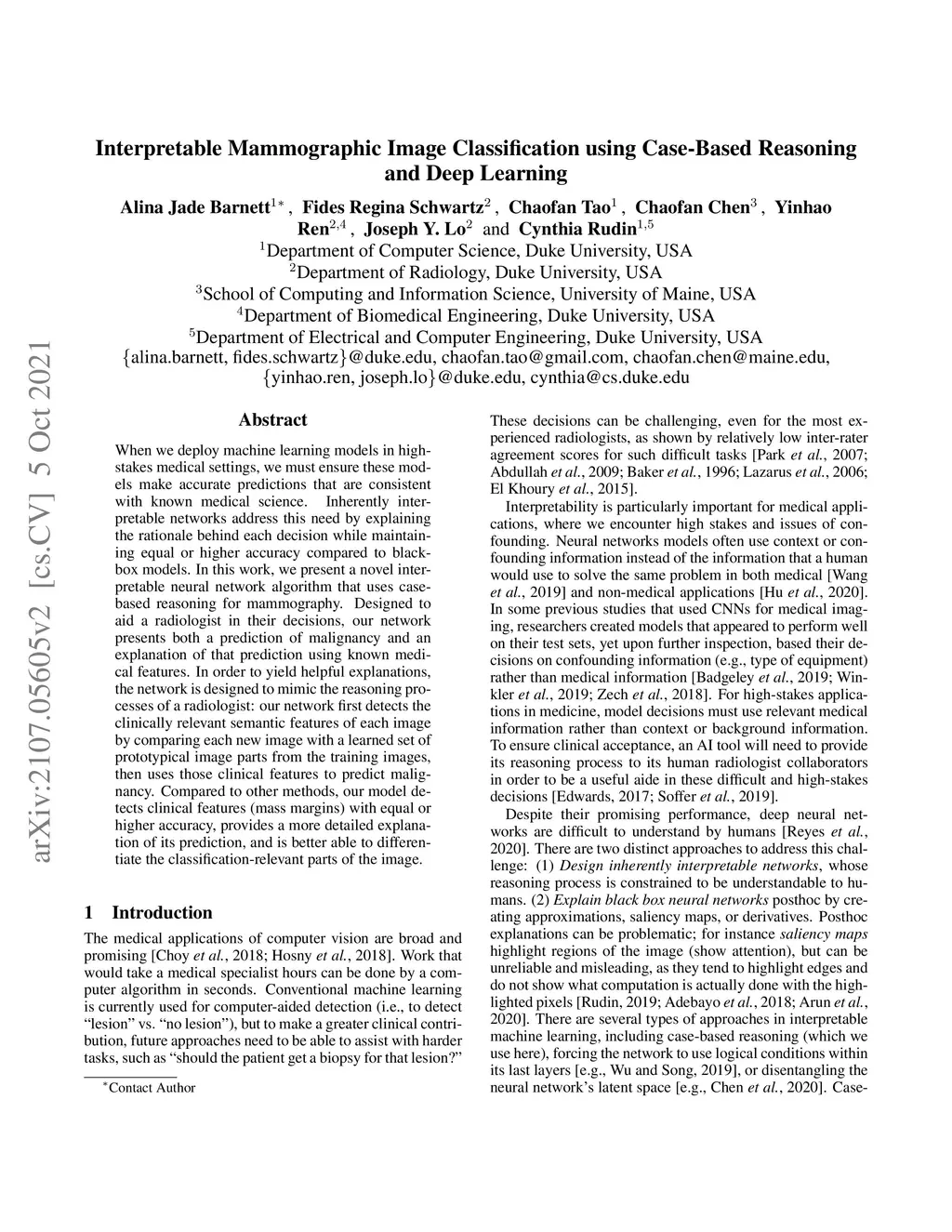 When we deploy machine learning models in high-stakes medical settings, we must ensure these models make accurate predictions that are consistent with known medical science. Inherently interpretable networks address this need by explaining the rationale behind each decision while maintaining equal or higher accuracy compared to black-box models. In this work, we present a novel interpretable neural network algorithm that uses case-based reasoning for mammography. Designed to aid a radiologist in their decisions, our network presents both a prediction of malignancy and an explanation of that prediction using known medical features. In order to yield helpful explanations, the network is designed to mimic the reasoning processes of a radiologist: our network first detects the clinically relevant semantic features of each image by comparing each new image with a learned set of prototypical image parts from the training images, then uses those clinical features to predict malignancy. Compared to other methods, our model detects clinical features (mass margins) with equal or higher accuracy, provides a more detailed explanation of its prediction, and is better able to differentiate the classification-relevant parts of the image.