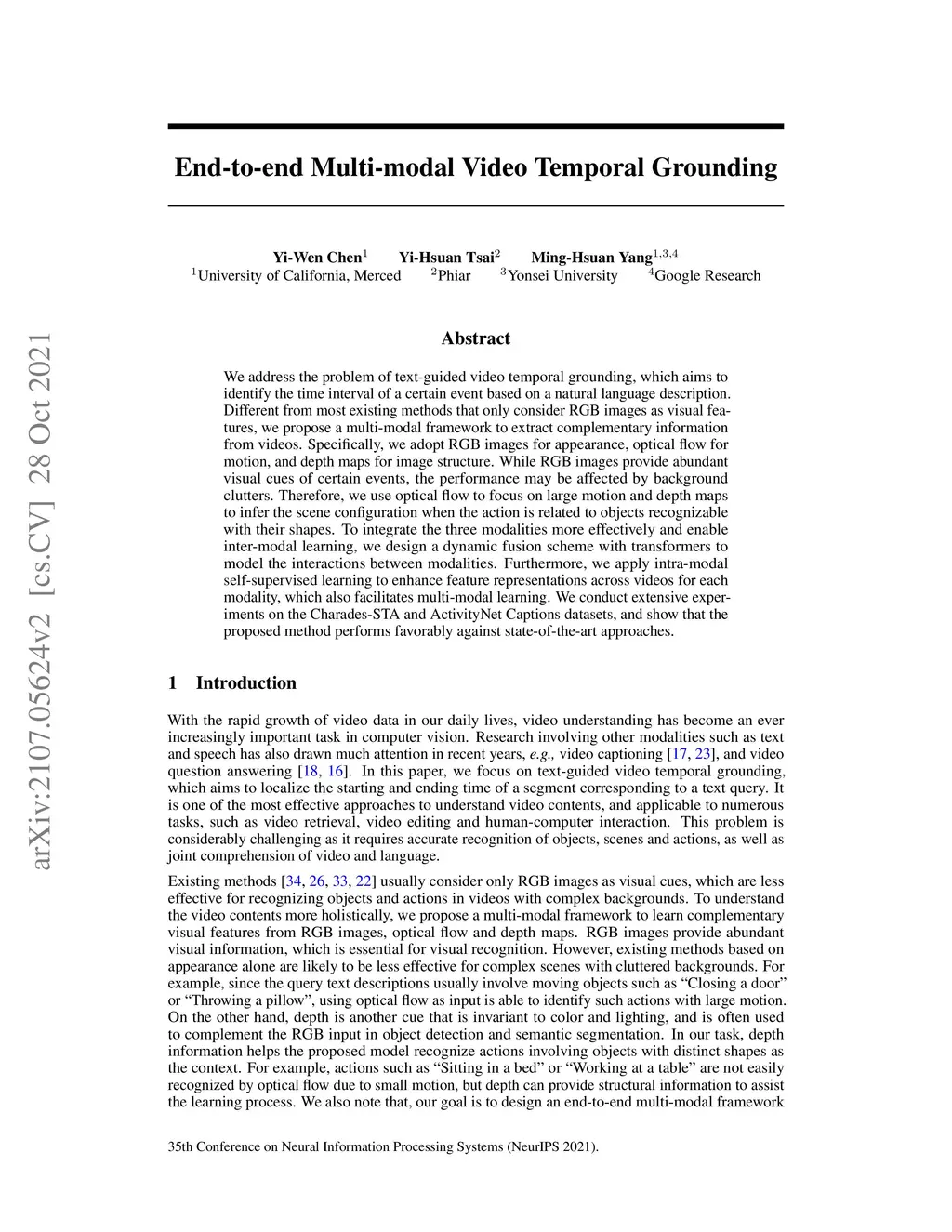 We address the problem of text-guided video temporal grounding, which aims to identify the time interval of a certain event based on a natural language description. Different from most existing methods that only consider RGB images as visual features, we propose a multi-modal framework to extract complementary information from videos. Specifically, we adopt RGB images for appearance, optical flow for motion, and depth maps for image structure. While RGB images provide abundant visual cues of certain events, the performance may be affected by background clutters. Therefore, we use optical flow to focus on large motion and depth maps to infer the scene configuration when the action is related to objects recognizable with their shapes. To integrate the three modalities more effectively and enable inter-modal learning, we design a dynamic fusion scheme with transformers to model the interactions between modalities. Furthermore, we apply intra-modal self-supervised learning to enhance feature representations across videos for each modality, which also facilitates multi-modal learning. We conduct extensive experiments on the Charades-STA and ActivityNet Captions datasets, and show that the proposed method performs favorably against state-of-the-art approaches.