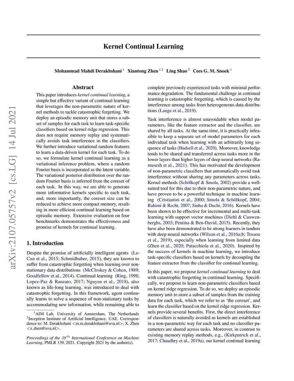 This paper introduces kernel continual learning, a simple but effective variant of continual learning that leverages the non-parametric nature of kernel methods to tackle catastrophic forgetting. We deploy an episodic memory unit that stores a subset of samples for each task to learn task-specific classifiers based on kernel ridge regression. This does not require memory replay and systematically avoids task interference in the classifiers. We further introduce variational random features to learn a data-driven kernel for each task. To do so, we formulate kernel continual learning as a variational inference problem, where a random Fourier basis is incorporated as the latent variable. The variational posterior distribution over the random Fourier basis is inferred from the coreset of each task. In this way, we are able to generate more informative kernels specific to each task, and, more importantly, the coreset size can be reduced to achieve more compact memory, resulting in more efficient continual learning based on episodic memory. Extensive evaluation on four benchmarks demonstrates the effectiveness and promise of kernels for continual learning.