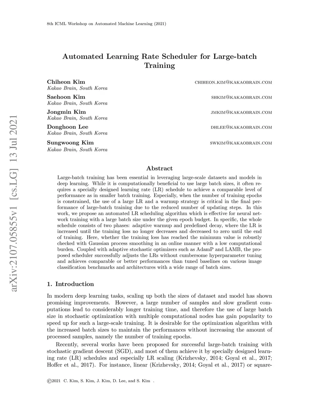 Large-batch training has been essential in leveraging large-scale datasets and models in deep learning. While it is computationally beneficial to use large batch sizes, it often requires a specially designed learning rate (LR) schedule to achieve a comparable level of performance as in smaller batch training. Especially, when the number of training epochs is constrained, the use of a large LR and a warmup strategy is critical in the final performance of large-batch training due to the reduced number of updating steps. In this work, we propose an automated LR scheduling algorithm which is effective for neural network training with a large batch size under the given epoch budget. In specific, the whole schedule consists of two phases: adaptive warmup and predefined decay, where the LR is increased until the training loss no longer decreases and decreased to zero until the end of training. Here, whether the training loss has reached the minimum value is robustly checked with Gaussian process smoothing in an online manner with a low computational burden. Coupled with adaptive stochastic optimizers such as AdamP and LAMB, the proposed scheduler successfully adjusts the LRs without cumbersome hyperparameter tuning and achieves comparable or better performances than tuned baselines on various image classification benchmarks and architectures with a wide range of batch sizes.