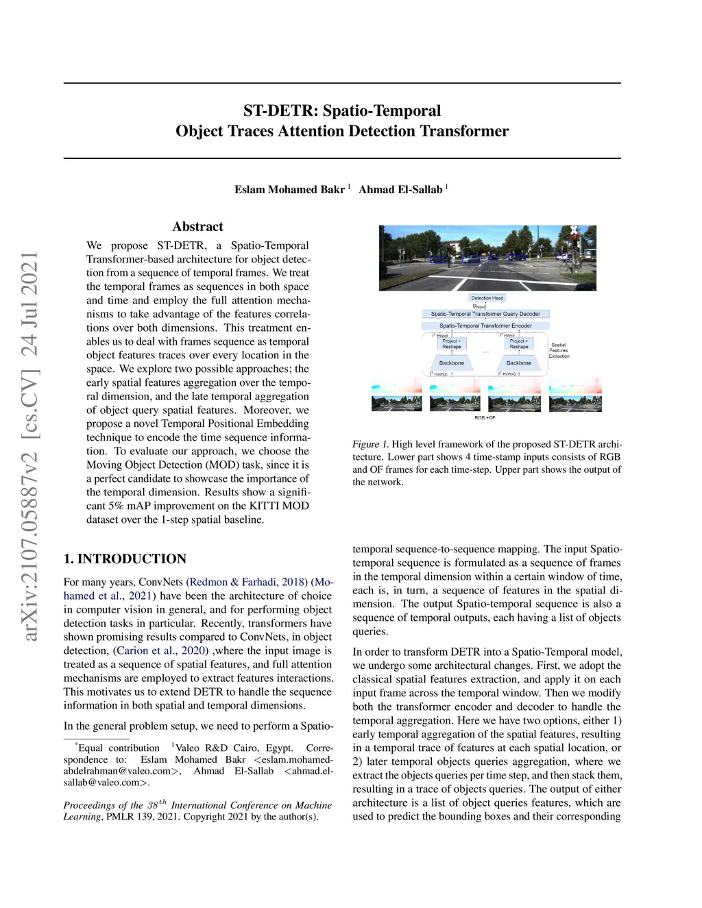 We propose ST-DETR, a Spatio-Temporal Transformer-based architecture for object detection from a sequence of temporal frames. We treat the temporal frames as sequences in both space and time and employ the full attention mechanisms to take advantage of the features correlations over both dimensions. This treatment enables us to deal with frames sequence as temporal object features traces over every location in the space. We explore two possible approaches; the early spatial features aggregation over the temporal dimension, and the late temporal aggregation of object query spatial features. Moreover, we propose a novel Temporal Positional Embedding technique to encode the time sequence information. To evaluate our approach, we choose the Moving Object Detection (MOD)task, since it is a perfect candidate to showcase the importance of the temporal dimension. Results show a significant 5% mAP improvement on the KITTI MOD dataset over the 1-step spatial baseline.