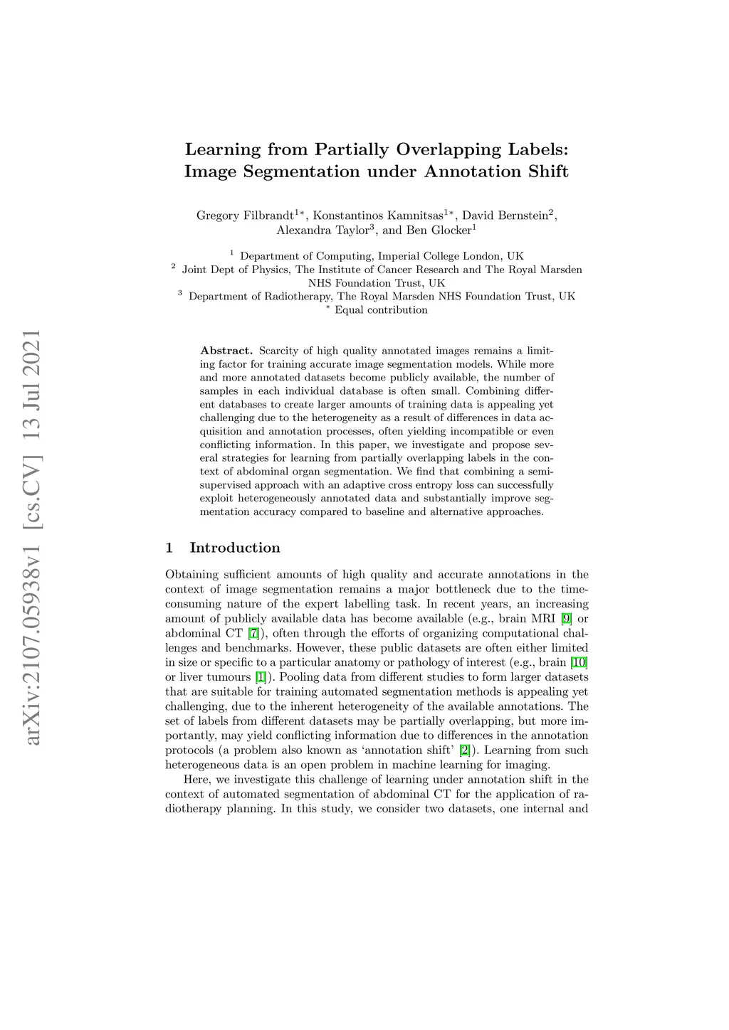 Scarcity of high quality annotated images remains a limiting factor for training accurate image segmentation models. While more and more annotated datasets become publicly available, the number of samples in each individual database is often small. Combining different databases to create larger amounts of training data is appealing yet challenging due to the heterogeneity as a result of differences in data acquisition and annotation processes, often yielding incompatible or even conflicting information. In this paper, we investigate and propose several strategies for learning from partially overlapping labels in the context of abdominal organ segmentation. We find that combining a semi-supervised approach with an adaptive cross entropy loss can successfully exploit heterogeneously annotated data and substantially improve segmentation accuracy compared to baseline and alternative approaches.