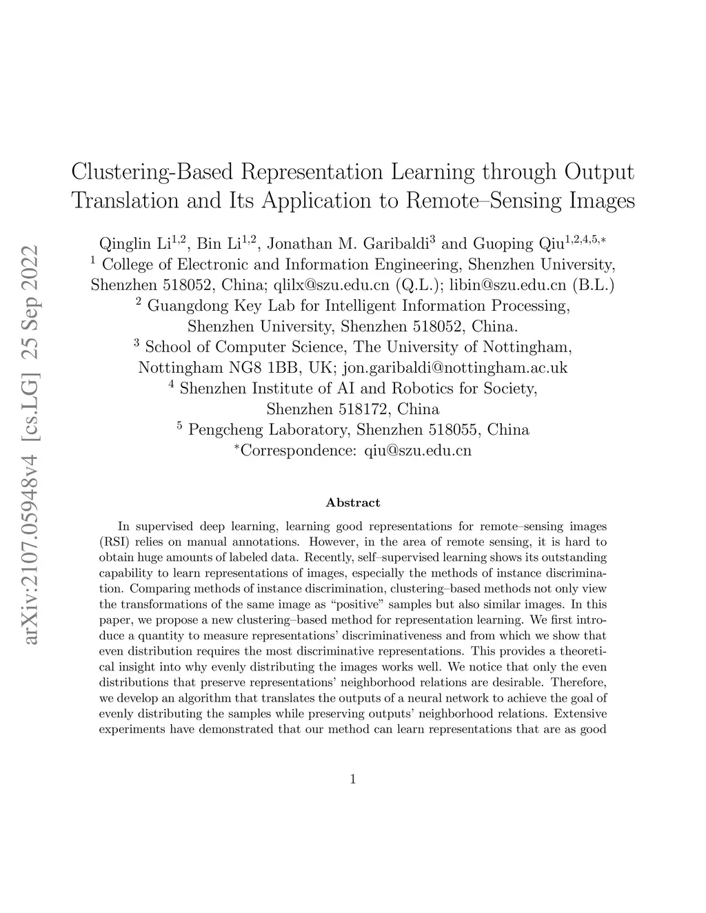 In supervised deep learning, learning good representations for remote--sensing images (RSI) relies on manual annotations. However, in the area of remote sensing, it is hard to obtain huge amounts of labeled data. Recently, self--supervised learning shows its outstanding capability to learn representations of images, especially the methods of instance discrimination. Comparing methods of instance discrimination, clustering--based methods not only view the transformations of the same image as ``positive" samples but also similar images. In this paper, we propose a new clustering-based method for representation learning. We first introduce a quantity to measure representations' discriminativeness and from which we show that even distribution requires the most discriminative representations. This provides a theoretical insight into why evenly distributing the images works well. We notice that only the even distributions that preserve representations' neighborhood relations are desirable. Therefore, we develop an algorithm that translates the outputs of a neural network to achieve the goal of evenly distributing the samples while preserving outputs' neighborhood relations. Extensive experiments have demonstrated that our method can learn representations that are as good as or better than the state of the art approaches, and that our method performs computationally efficiently and robustly on various RSI datasets.