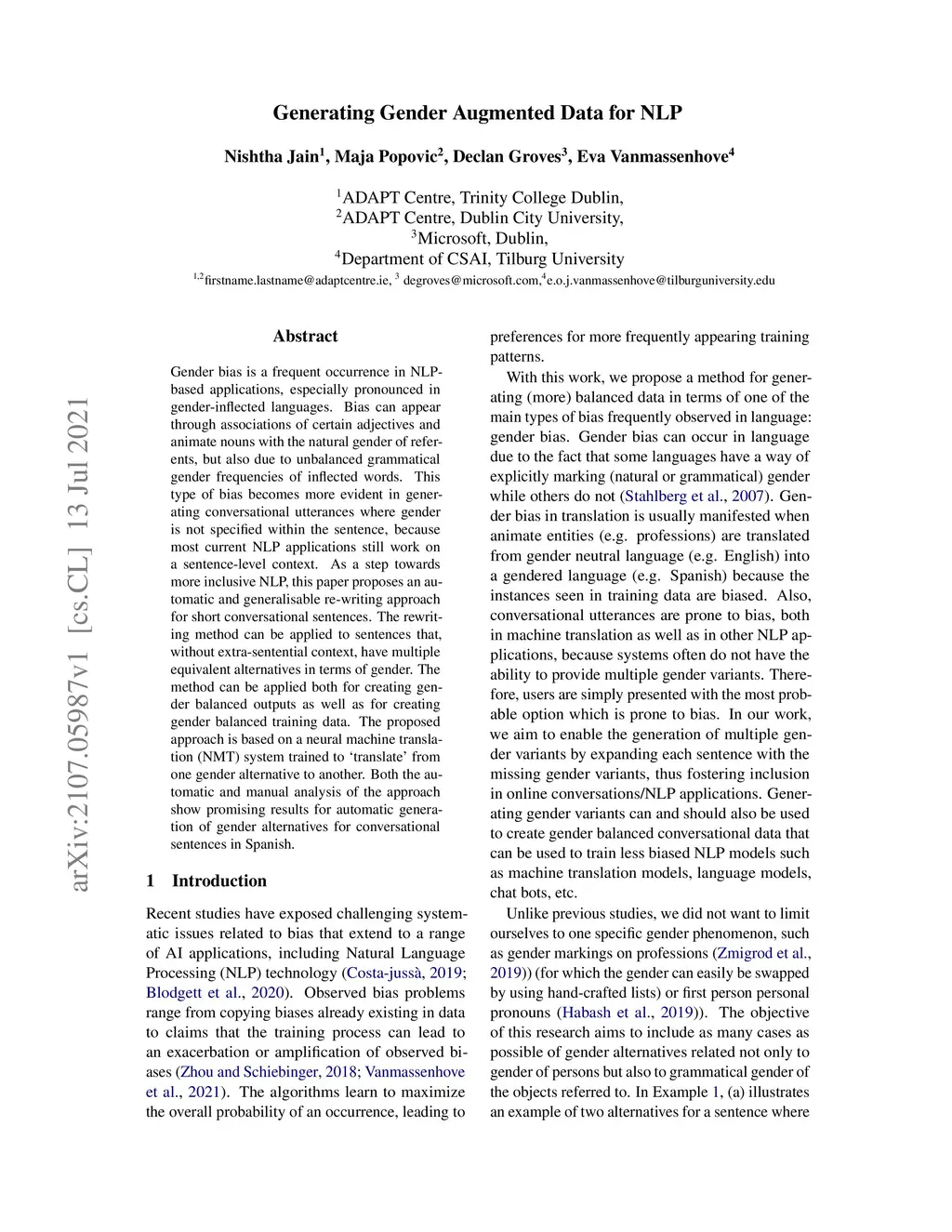 Gender bias is a frequent occurrence in NLP-based applications, especially pronounced in gender-inflected languages. Bias can appear through associations of certain adjectives and animate nouns with the natural gender of referents, but also due to unbalanced grammatical gender frequencies of inflected words. This type of bias becomes more evident in generating conversational utterances where gender is not specified within the sentence, because most current NLP applications still work on a sentence-level context. As a step towards more inclusive NLP, this paper proposes an automatic and generalisable rewriting approach for short conversational sentences. The rewriting method can be applied to sentences that, without extra-sentential context, have multiple equivalent alternatives in terms of gender. The method can be applied both for creating gender balanced outputs as well as for creating gender balanced training data. The proposed approach is based on a neural machine translation (NMT) system trained to 'translate' from one gender alternative to another. Both the automatic and manual analysis of the approach show promising results for automatic generation of gender alternatives for conversational sentences in Spanish.