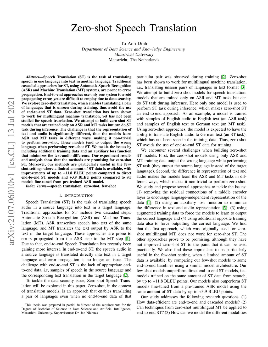 Speech Translation (ST) is the task of translating speech in one language into text in another language. Traditional cascaded approaches for ST, using Automatic Speech Recognition (ASR) and Machine Translation (MT) systems, are prone to error propagation. End-to-end approaches use only one system to avoid propagating error, yet are difficult to employ due to data scarcity. We explore zero-shot translation, which enables translating a pair of languages that is unseen during training, thus avoid the use of end-to-end ST data. Zero-shot translation has been shown to work for multilingual machine translation, yet has not been studied for speech translation. We attempt to build zero-shot ST models that are trained only on ASR and MT tasks but can do ST task during inference. The challenge is that the representation of text and audio is significantly different, thus the models learn ASR and MT tasks in different ways, making it non-trivial to perform zero-shot. These models tend to output the wrong language when performing zero-shot ST. We tackle the issues by including additional training data and an auxiliary loss function that minimizes the text-audio difference. Our experiment results and analysis show that the methods are promising for zero-shot ST. Moreover, our methods are particularly useful in the few-shot settings where a limited amount of ST data is available, with improvements of up to +11.8 BLEU points compared to direct end-to-end ST models and +3.9 BLEU points compared to ST models fine-tuned from pre-trained ASR model.
