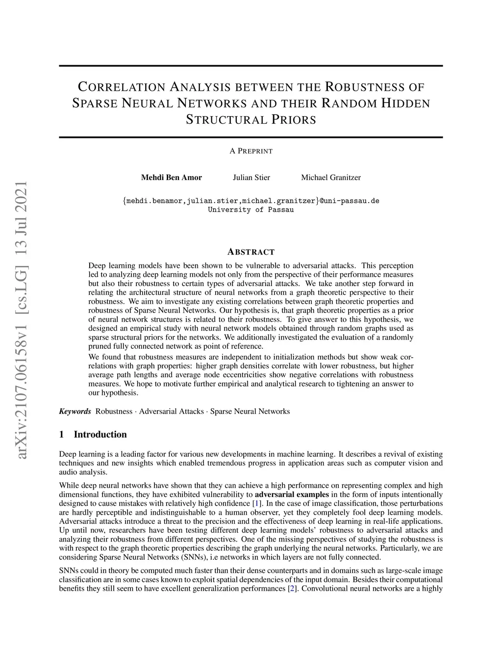 Deep learning models have been shown to be vulnerable to adversarial attacks. This perception led to analyzing deep learning models not only from the perspective of their performance measures but also their robustness to certain types of adversarial attacks. We take another step forward in relating the architectural structure of neural networks from a graph theoretic perspective to their robustness. We aim to investigate any existing correlations between graph theoretic properties and the robustness of Sparse Neural Networks. Our hypothesis is, that graph theoretic properties as a prior of neural network structures are related to their robustness. To answer to this hypothesis, we designed an empirical study with neural network models obtained through random graphs used as sparse structural priors for the networks. We additionally investigated the evaluation of a randomly pruned fully connected network as a point of reference. We found that robustness measures are independent of initialization methods but show weak correlations with graph properties: higher graph densities correlate with lower robustness, but higher average path lengths and average node eccentricities show negative correlations with robustness measures. We hope to motivate further empirical and analytical research to tightening an answer to our hypothesis.
