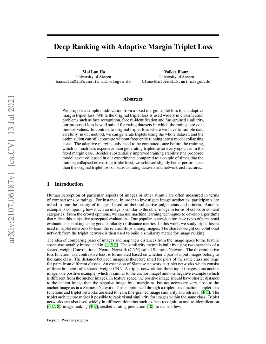 We propose a simple modification from a fixed margin triplet loss to an adaptive margin triplet loss. While the original triplet loss is used widely in classification problems such as face recognition, face re-identification and fine-grained similarity, our proposed loss is well suited for rating datasets in which the ratings are continuous values. In contrast to original triplet loss where we have to sample data carefully, in out method, we can generate triplets using the whole dataset, and the optimization can still converge without frequently running into a model collapsing issue. The adaptive margins only need to be computed once before the training, which is much less expensive than generating triplets after every epoch as in the fixed margin case. Besides substantially improved training stability (the proposed model never collapsed in our experiments compared to a couple of times that the training collapsed on existing triplet loss), we achieved slightly better performance than the original triplet loss on various rating datasets and network architectures.