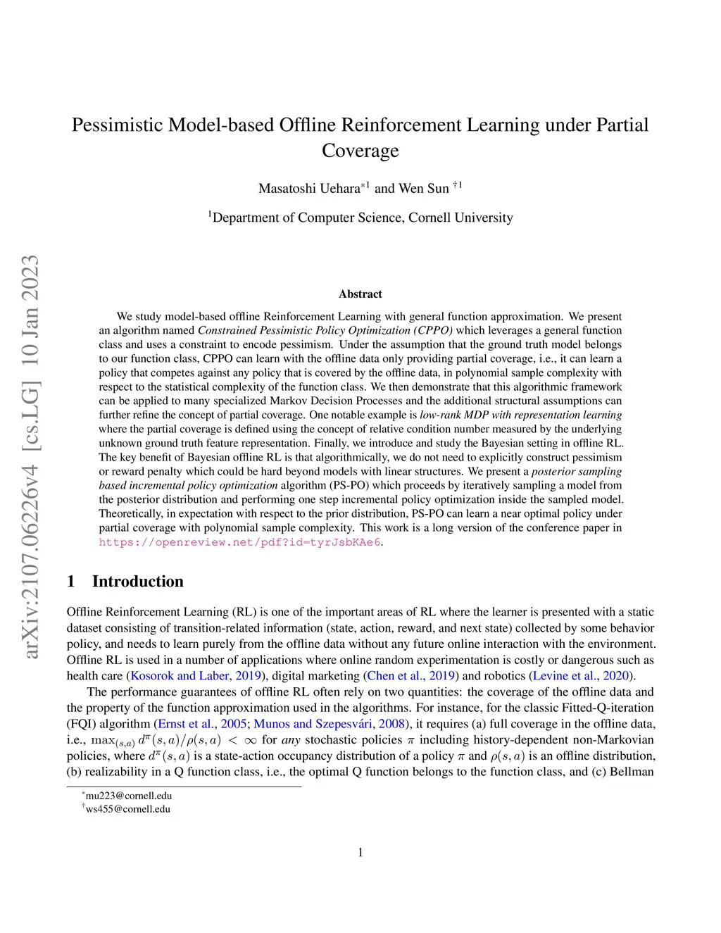 We study model-based offline Reinforcement Learning with general function approximation without a full coverage assumption on the offline data distribution. We present an algorithm named Constrained Pessimistic Policy Optimization (CPPO)which leverages a general function class and uses a constraint over the model class to encode pessimism. Under the assumption that the ground truth model belongs to our function class (i.e., realizability in the function class), CPPO has a PAC guarantee with offline data only providing partial coverage, i.e., it can learn a policy that competes against any policy that is covered by the offline data. We then demonstrate that this algorithmic framework can be applied to many specialized Markov Decision Processes where additional structural assumptions can further refine the concept of partial coverage. Two notable examples are: (1) low-rank MDP with representation learning where the partial coverage condition is defined using a relative condition number measured by the unknown ground truth feature representation; (2) factored MDP where the partial coverage condition is defined using density ratio based concentrability coefficients associated with individual factors.