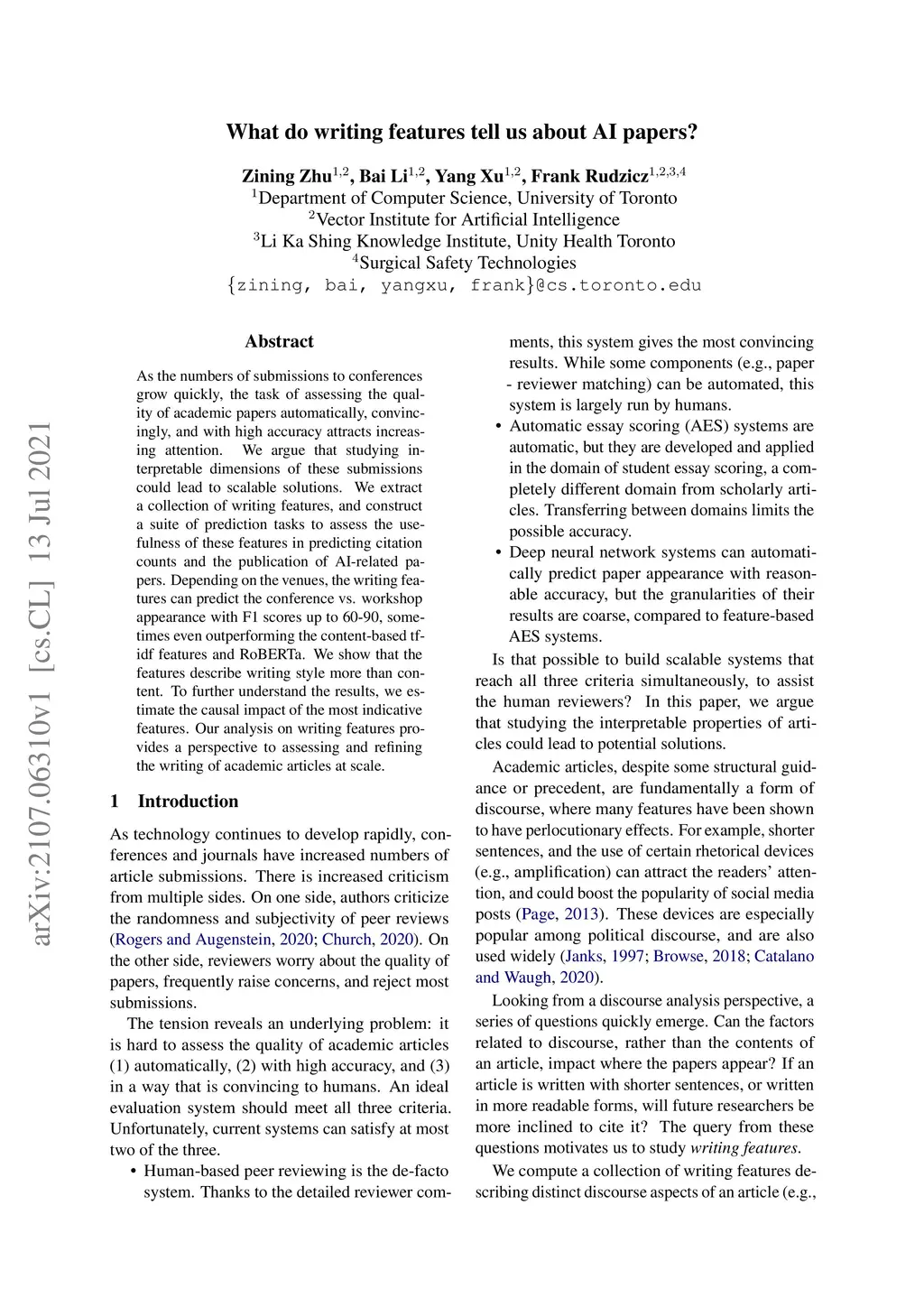 As the numbers of submissions to conferences grow quickly, the task of assessing the quality of academic papers automatically, convincingly, and with high accuracy attracts increasing attention. We argue that studying interpretable dimensions of these submissions could lead to scalable solutions. We extract a collection of writing features, and construct a suite of prediction tasks to assess the usefulness of these features in predicting citation counts and the publication of AI-related papers. Depending on the venues, the writing features can predict the conference vs. workshop appearance with F1 scores up to 60-90, sometimes even outperforming the content-based tf-idf features and RoBERTa. We show that the features describe writing style more than content. To further understand the results, we estimate the causal impact of the most indicative features. Our analysis on writing features provides a perspective to assessing and refining the writing of academic articles at scale.