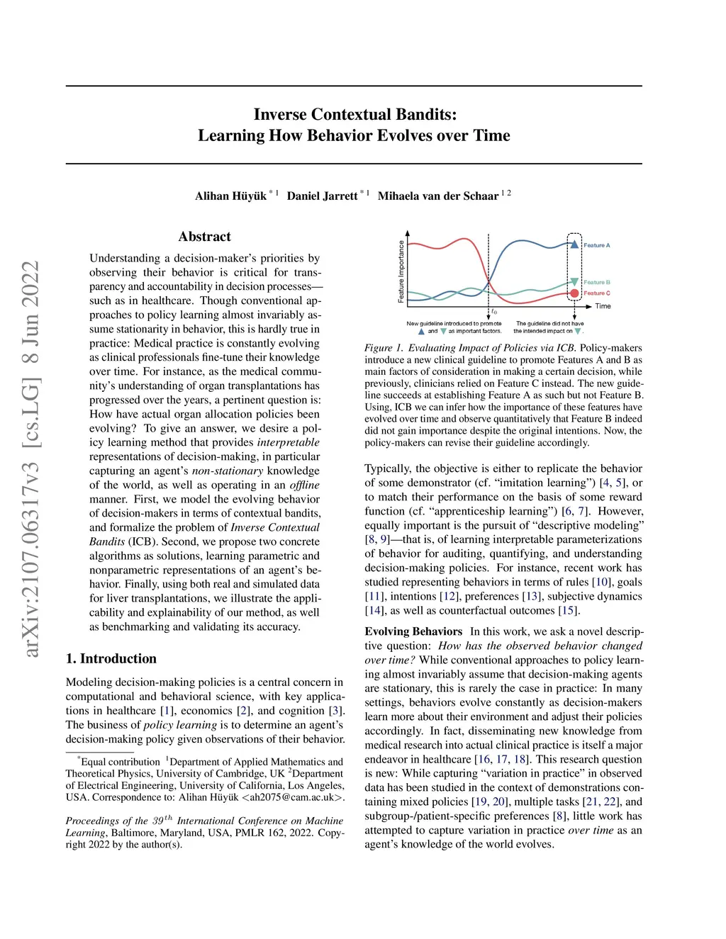 Understanding a decision-maker's priorities by observing their behavior is critical for transparency and accountability in decision processes, such as in healthcare. Though conventional approaches to policy learning almost invariably assume stationarity in behavior, this is hardly true in practice: Medical practice is constantly evolving as clinical professionals fine-tune their knowledge over time. For instance, as the medical community's understanding of organ transplantations has progressed over the years, a pertinent question is: How have actual organ allocation policies been evolving? To give an answer, we desire a policy learning method that provides interpretable representations of decision-making, in particular capturing an agent's non-stationary knowledge of the world, as well as operating in an offline manner. First, we model the evolving behavior of decision-makers in terms of contextual bandits, and formalize the problem of Inverse Contextual Bandits (ICB). Second, we propose two concrete algorithms as solutions, learning parametric and nonparametric representations of an agent's behavior. Finally, using both real and simulated data for liver transplantations, we illustrate the applicability and explainability of our method, as well as benchmarking and validating its accuracy.