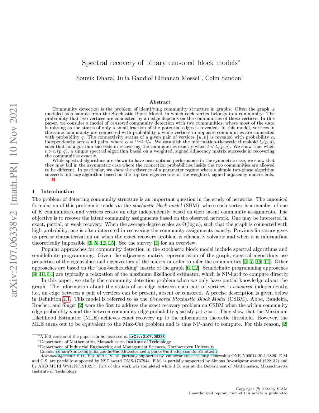Community detection is the problem of identifying community structure in graphs. Often the graph is modeled as a sample from the Stochastic Block Model, in which each vertex belongs to a community. The probability that two vertices are connected by an edge depends on the communities of those vertices. In this paper, we consider a model of {\em censored} community detection with two communities, where most of the data is missing as the status of only a small fraction of the potential edges is revealed. In this model, vertices in the same community are connected with probability while vertices in opposite communities are connected with probability . The connectivity status of a given pair of vertices is revealed with probability , independently across all pairs, where . We establish the information-theoretic threshold , such that no algorithm succeeds in recovering the communities exactly when . We show that when , a simple spectral algorithm based on a weighted, signed adjacency matrix succeeds in recovering the communities exactly. While spectral algorithms are shown to have near-optimal performance in the symmetric case, we show that they may fail in the asymmetric case where the connection probabilities inside the two communities are allowed to be different. In particular, we show the existence of a parameter regime where a simple two-phase algorithm succeeds but any algorithm based on the top two eigenvectors of the weighted, signed adjacency matrix fails.
