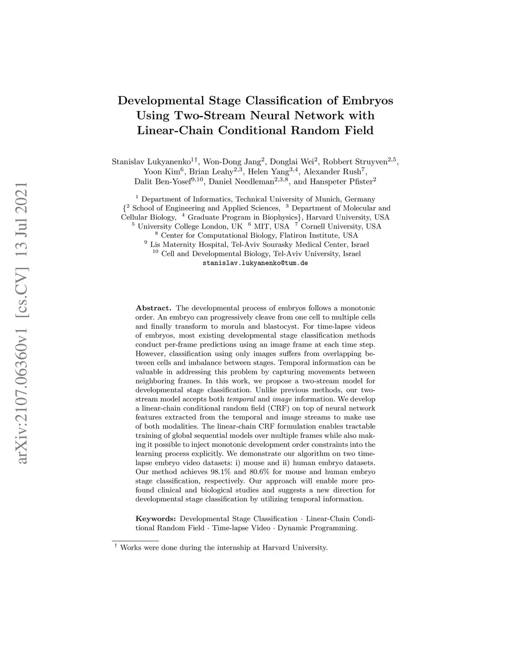 The developmental process of embryos follows a monotonic order. An embryo can progressively cleave from one cell to multiple cells and finally transform to morula and blastocyst. For time-lapse videos of embryos, most existing developmental stage classification methods conduct per-frame predictions using an image frame at each time step. However, classification using only images suffers from overlapping between cells and imbalance between stages. Temporal information can be valuable in addressing this problem by capturing movements between neighboring frames. In this work, we propose a two-stream model for developmental stage classification. Unlike previous methods, our two-stream model accepts both temporal and image information. We develop a linear-chain conditional random field (CRF) on top of neural network features extracted from the temporal and image streams to make use of both modalities. The linear-chain CRF formulation enables tractable training of global sequential models over multiple frames while also making it possible to inject monotonic development order constraints into the learning process explicitly. We demonstrate our algorithm on two time-lapse embryo video datasets: i) mouse and ii) human embryo datasets. Our method achieves 98.1 % and 80.6 % for mouse and human embryo stage classification, respectively. Our approach will enable more profound clinical and biological studies and suggests a new direction for developmental stage classification by utilizing temporal information.