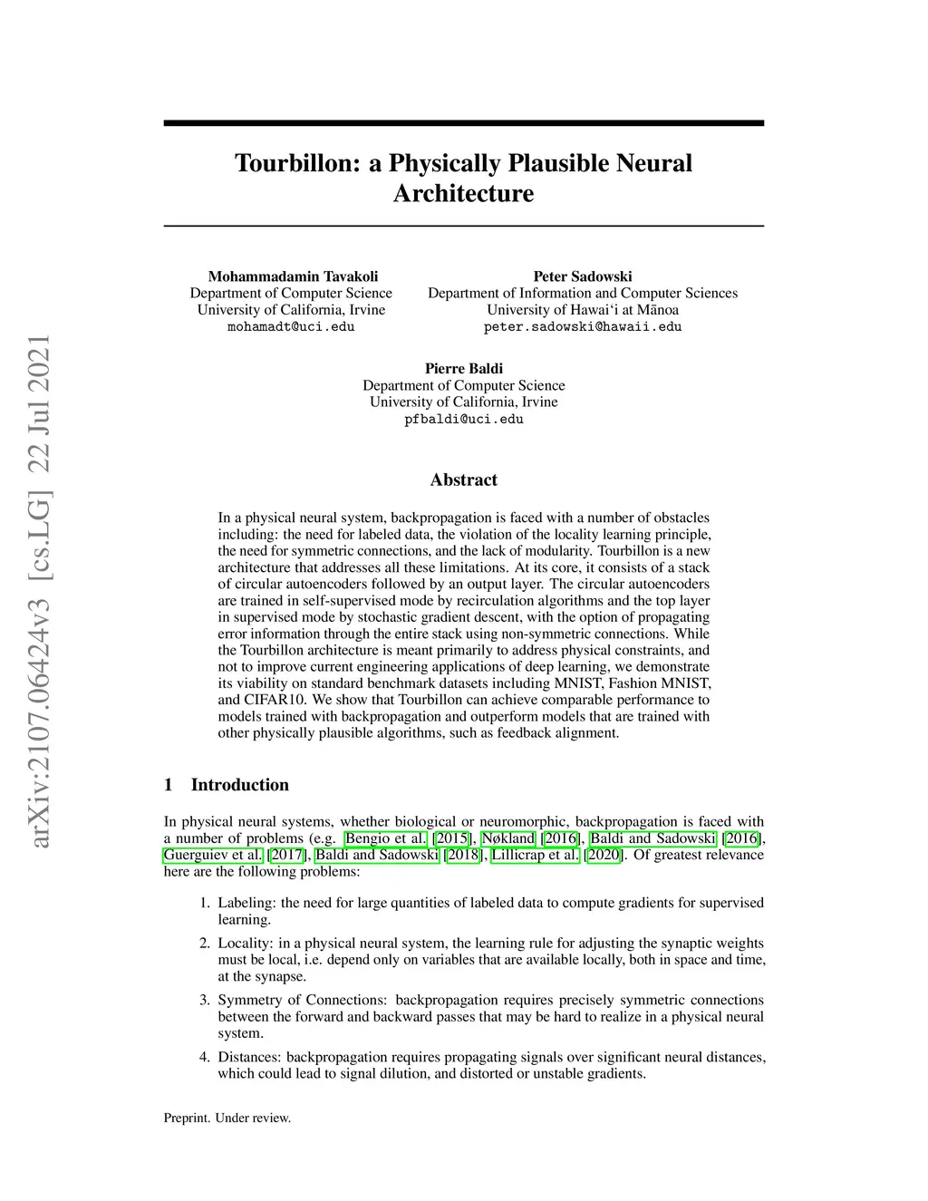 In a physical neural system, backpropagation is faced with a number of obstacles including: the need for labeled data, the violation of the locality learning principle, the need for symmetric connections, and the lack of modularity. Tourbillon is a new architecture that addresses all these limitations. At its core, it consists of a stack of circular autoencoders followed by an output layer. The circular autoencoders are trained in self-supervised mode by recirculation algorithms and the top layer in supervised mode by stochastic gradient descent, with the option of propagating error information through the entire stack using non-symmetric connections. While the Tourbillon architecture is meant primarily to address physical constraints, and not to improve current engineering applications of deep learning, we demonstrate its viability on standard benchmark datasets including MNIST, Fashion MNIST, and CIFAR10. We show that Tourbillon can achieve comparable performance to models trained with backpropagation and outperform models that are trained with other physically plausible algorithms, such as feedback alignment.
