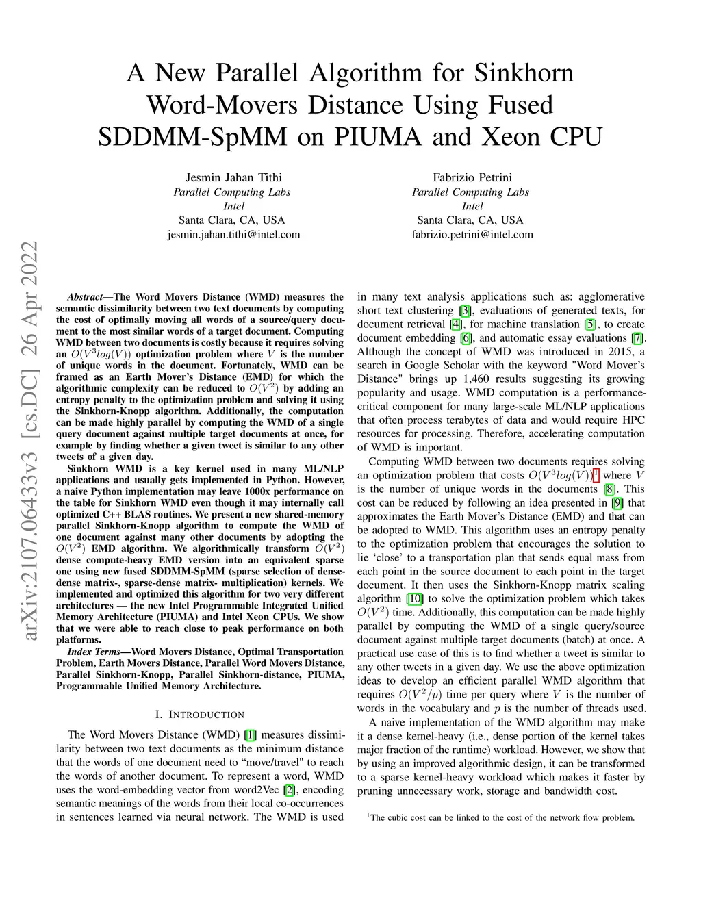 The Word Movers Distance (WMD) measures the semantic dissimilarity between two text documents by computing the cost of optimally moving all words of a source/query document to the most similar words of a target document. Computing WMD between two documents is costly because it requires solving an optimization problem where is the number of unique words in the document. Fortunately, WMD can be framed as an Earth Mover's Distance (EMD) for which the algorithmic complexity can be reduced to by adding an entropy penalty to the optimization problem and solving it using the Sinkhorn-Knopp algorithm. Additionally, the computation can be made highly parallel by adopting a batching approach, i.e., computing the WMD of a single query document against multiple target documents at once. Sinkhorn WMD is a key kernel used in many ML/NLP applications. and usually gets implemented in Python. However, a straightforward Python implementation may leave significant performance on the table even though it may internally call optimized C++ BLAS routines. We present a new sparse {P}arallel {A}lgorithm for {S}inkhorn-Knopp {W}ord-movers {D}istance to compute the semantic distance of one document to many other documents by adopting the EMD algorithm. We algorithmically transform dense compute-heavy EMD version into an equivalent sparse one using new fused SDDMM-SpMM (sparse selection of dense-dense matrix-, sparse-dense matrix-multiplication) kernels. We implemented and optimized this algorithm for two very different architectures -- the new Intel Programmable Integrated Unified Memory Architecture (PIUMA) and Intel Xeon CPUs. We show that we were able to reach close to peak performance on both platforms.