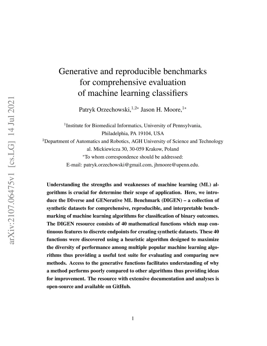 Understanding the strengths and weaknesses of machine learning (ML) algorithms is crucial for determine their scope of application. Here, we introduce the DIverse and GENerative ML Benchmark (DIGEN) - a collection of synthetic datasets for comprehensive, reproducible, and interpretable benchmarking of machine learning algorithms for classification of binary outcomes. The DIGEN resource consists of 40 mathematical functions which map continuous features to discrete endpoints for creating synthetic datasets. These 40 functions were discovered using a heuristic algorithm designed to maximize the diversity of performance among multiple popular machine learning algorithms thus providing a useful test suite for evaluating and comparing new methods. Access to the generative functions facilitates understanding of why a method performs poorly compared to other algorithms thus providing ideas for improvement. The resource with extensive documentation and analyses is open-source and available on GitHub.
